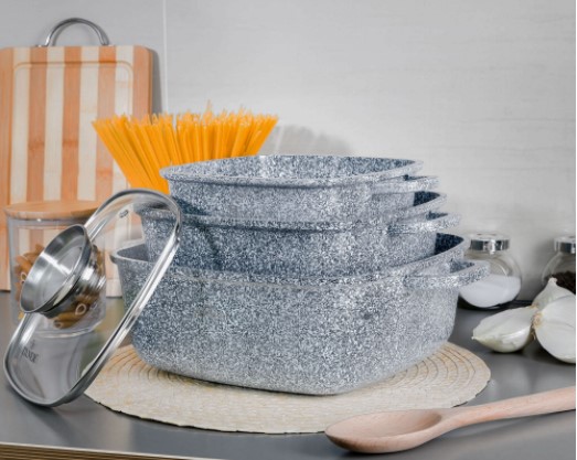 Die Töpfe des Sets werden aus hochwertigem Aluminium gefertigt, wodurch sie korrosions- und mechanisch verformungsbeständig sind. Die Töpfe können auf allen Arten von Kochfeldern verwendet werden, einschließlich Induktionskochfeldern, und sind spülmaschinenfest. Darüber hinaus sind sie für die Verwendung im Backofen geeignet, sodass Sie Gerichte in einem einzigen Topf sowohl anbraten als auch schmoren können.