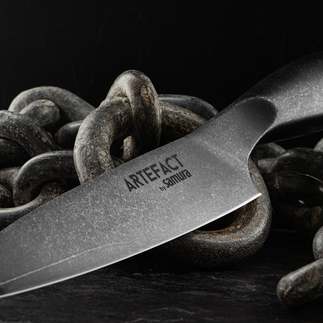 - Die Messer der ARTEFACT-Serie zeichnen sich dadurch aus, dass ihr einzigartiges Design an antike, aus Stein geschmiedete Messer erinnert. Diese Messer verfügen über ergonomische Edelstahlgriffe und überragende Stärke, Schärfe und hochwertige Klingen aus 5 Lagen AUS-10-Edelstahl, verstärkt mit Molybdän-Vanadium, um sie scharf zu halten.