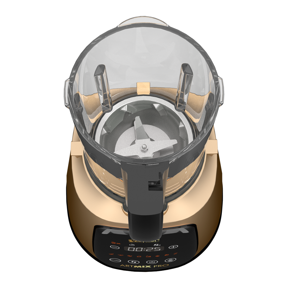 ArtMix Pro ist eine innovative Küchenmaschine, die Koch- und Mixfunktionen kombiniert und es ermöglicht, schnell und einfach gesunde und leckere Gerichte zuzubereiten. Dieses Gerät verfügt über 16 automatische Programmiermodi und die Möglichkeit zur manuellen Steuerung, während die integrierte Vakuumfunktion für bis zu 50 % glattere Ergebnisse und besseren Geschmack sorgt, indem sie überschüssige Luft aus dem Mischbehälter entfernt.