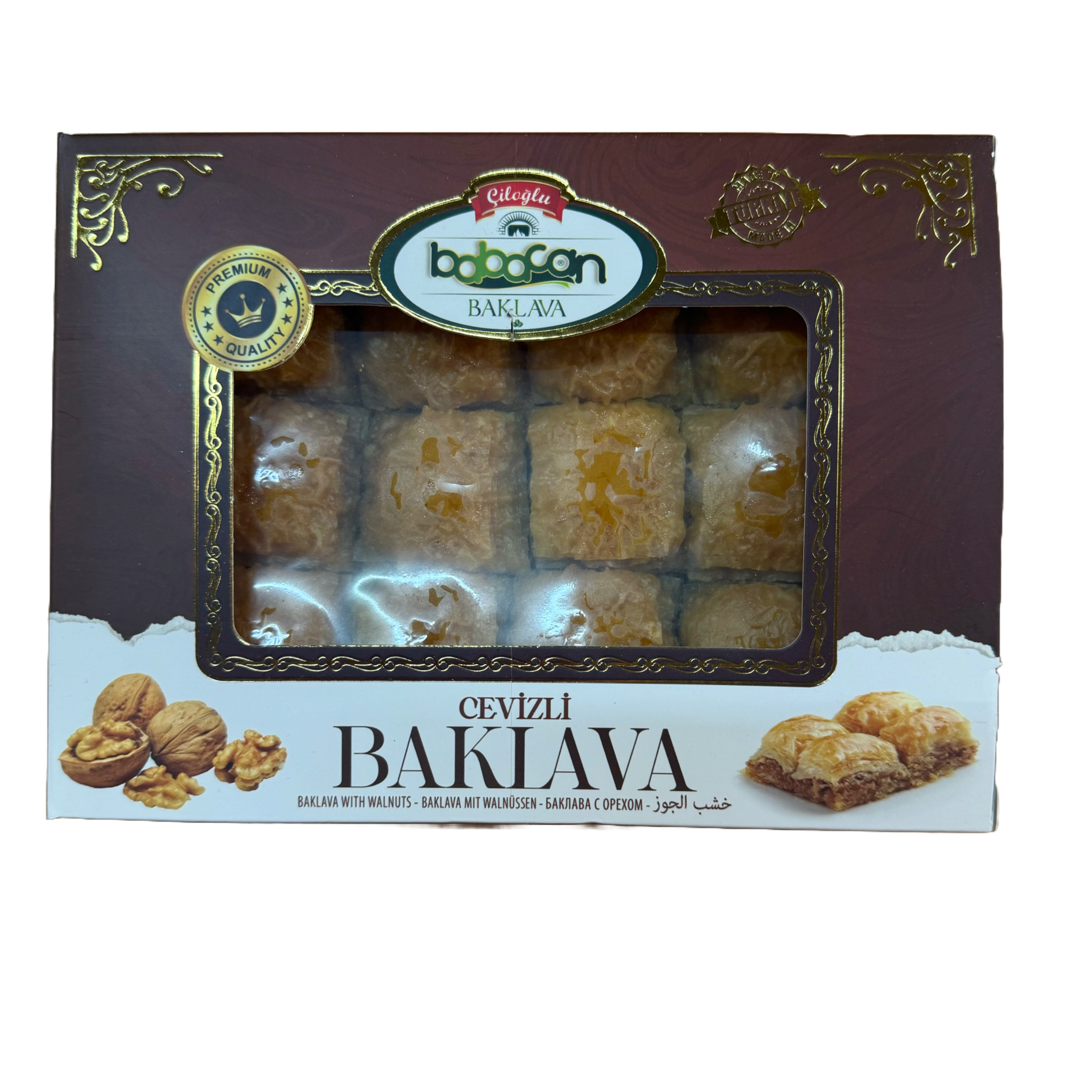 CILOGLU Baklava mit griechischen Walnüssen ist eine ausgezeichnete Wahl für diejenigen, die traditionelle Desserts aus dem Osten mögen. Dieses schichtige Gebäck, hergestellt aus dünnen Teigschichten, griechischen Walnüssen und süßem Sirup, wird Ihnen einen unverwechselbaren Geschmack und Genuss bieten.