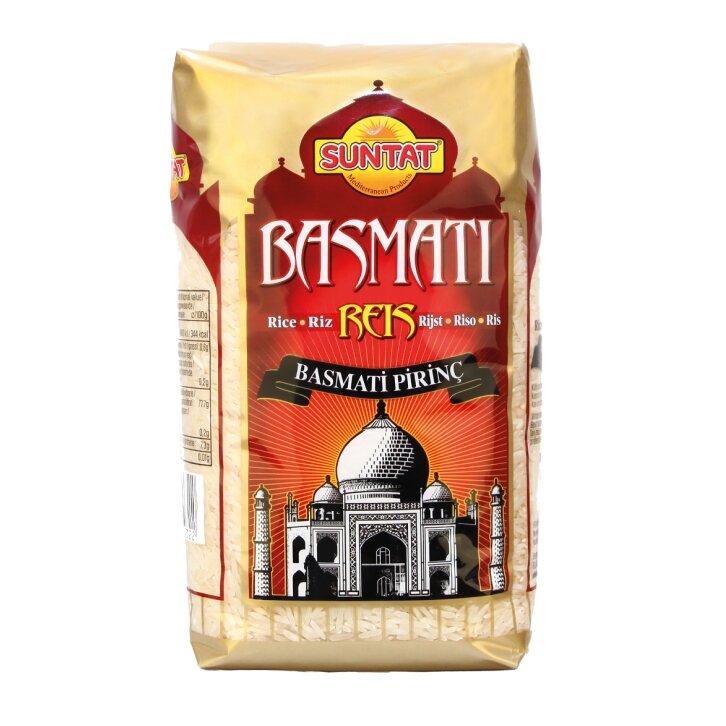 Suntat Basmati-Reis – ein Beutel mit dem höchsten Qualitätsstandard des weltweit verwendeten Produkts. In Indien und im Nahen Osten ist dies die hauptsächlich für die Zubereitung von Speisen verwendete Reissorte. Basmati ist eine Langkorn-Reissorte, die durch eine leichte Nussnote gekennzeichnet ist. Beim Kochen verlängern sie sich und werden locker und aromatisch. Sie werden am Fuße des Himalaya, in Teilen Indiens und Pakistans angebaut und werden oft mit edlem Safran gewürzt, um ihnen einen goldenen Farbton und königlichen Geschmack zu verleihen. Basmati-Reis wird für die harmonische Kombination von Geschmack und Aroma geschätzt, insbesondere für sein appetitanregendes Aussehen auf dem Teller und wird häufig als vollwertige Beilage zu Fleisch- und Fischgerichten verwendet. In Indien glaubt man, dass dieser Reis nicht einmal gesalzen oder mit anderen Gewürzen gewürzt werden muss.