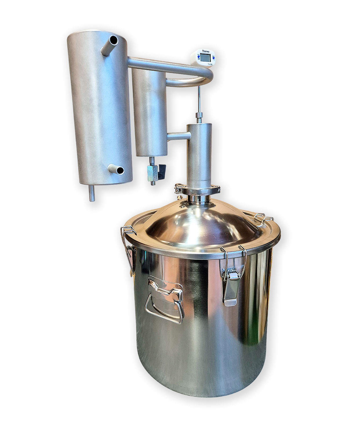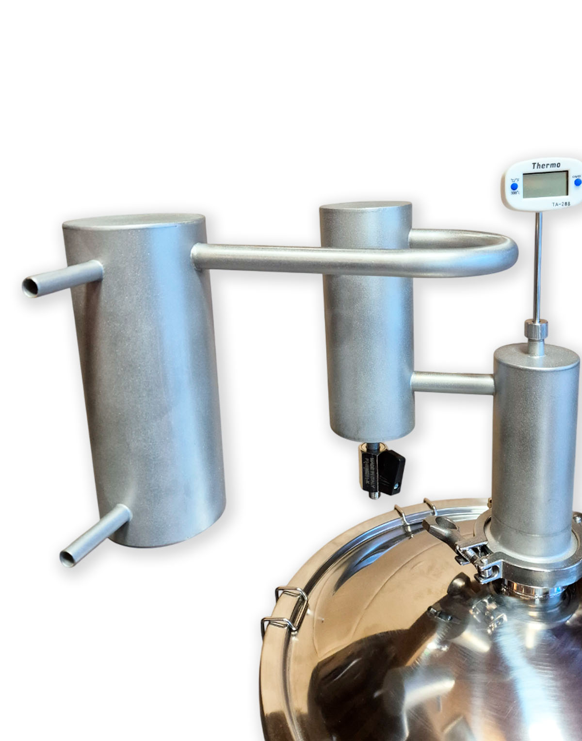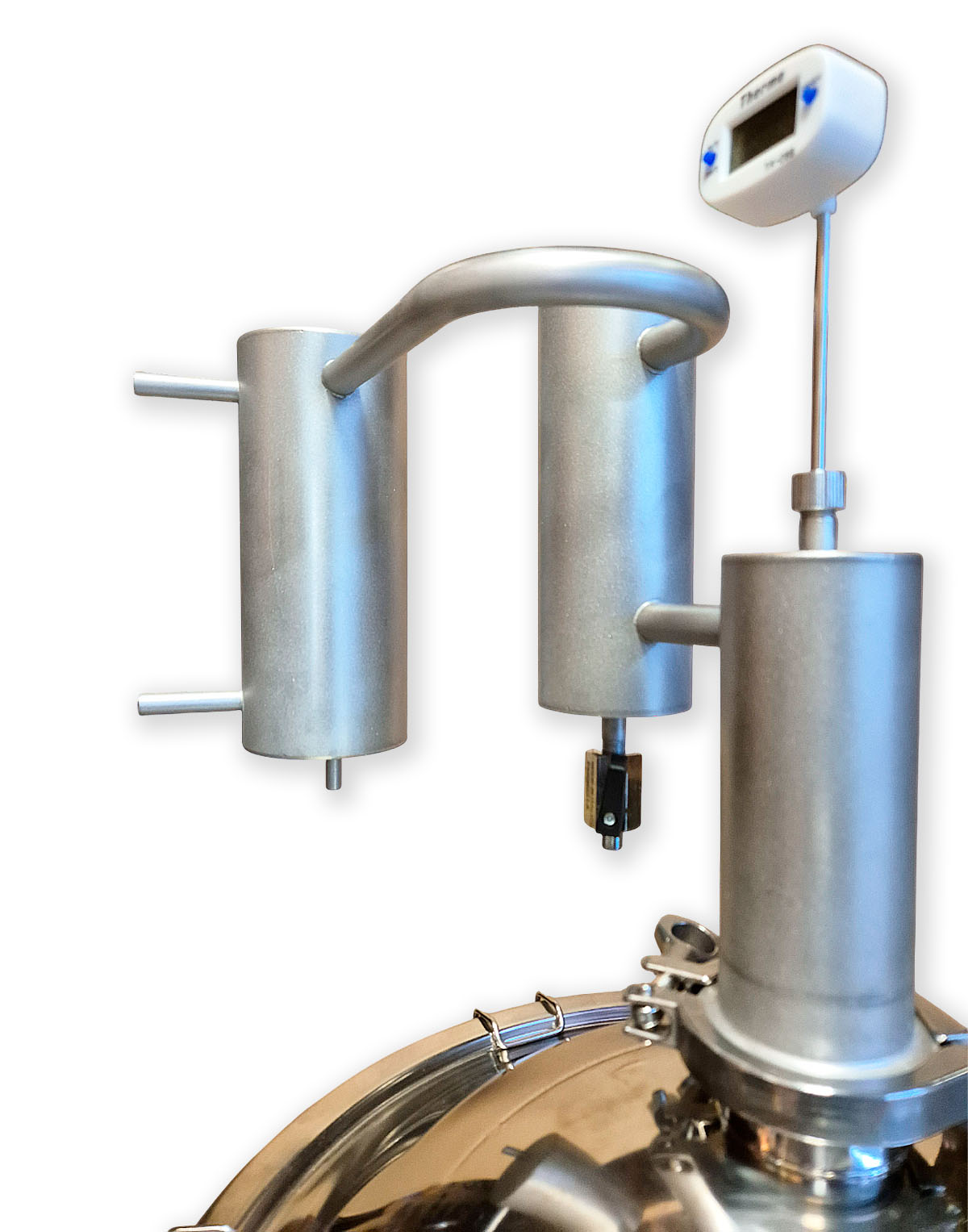 • Eigenständige Modifikationsmöglichkeit – 2″-Klemmverbindung (Schellenanschluss) gibt die Möglichkeit, andere Komponenten für die Destillation zu verwenden, z.B., eine zusätzliche Zarge, ein Diopter oder einen Alembik;