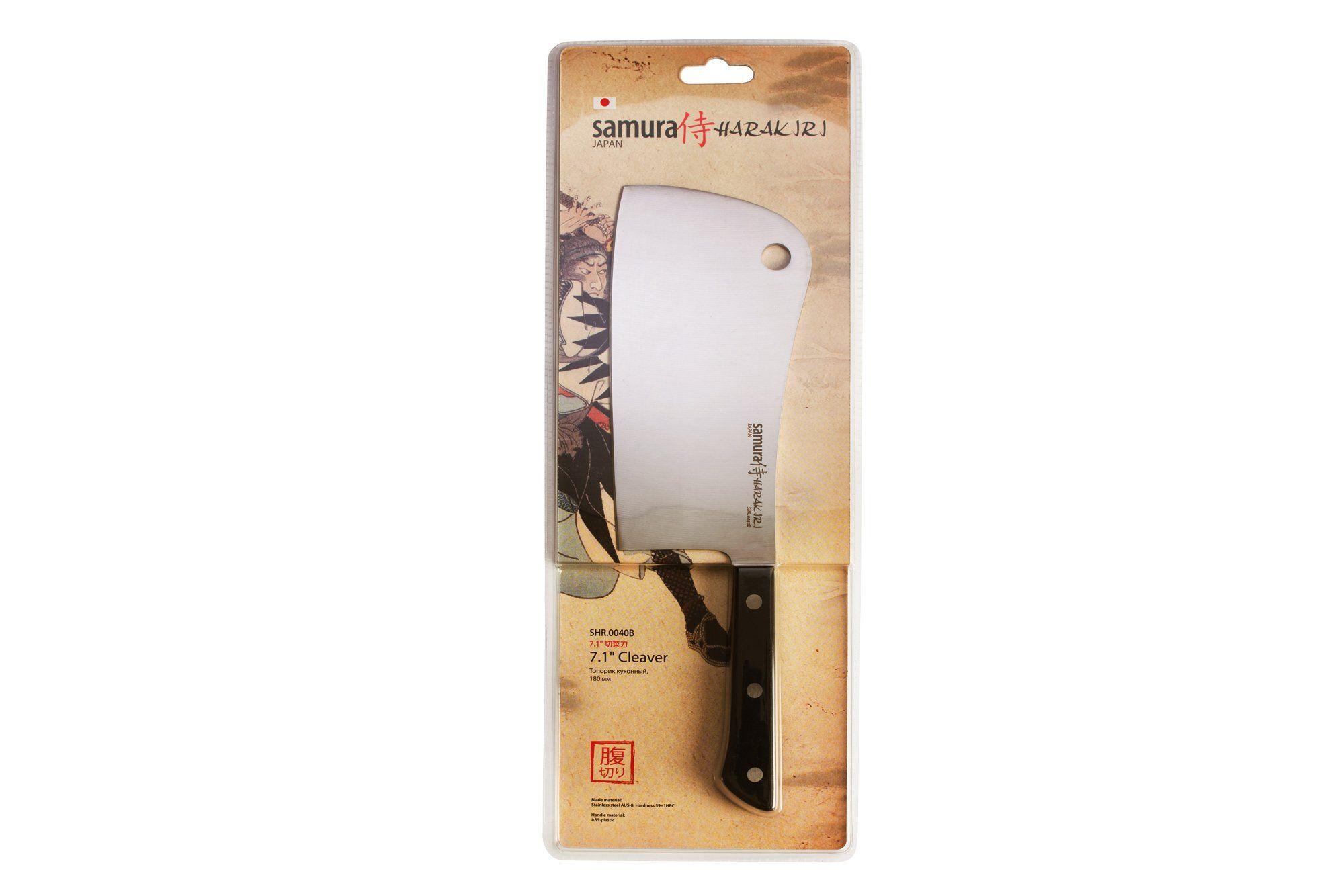 Das Küchenbeil zum Hacken von Fleisch und Knochen aus der Samura Harakiri-Kollektion ist ein schweres und massives Kochwerkzeug. Es hilft, Fleisch, Geflügel und Fisch schnell zu schneiden. Mit seiner Hilfe kommt jeder Koch problemlos mit Knorpel, Sehnen und sogar kleinen Knochen zurecht.