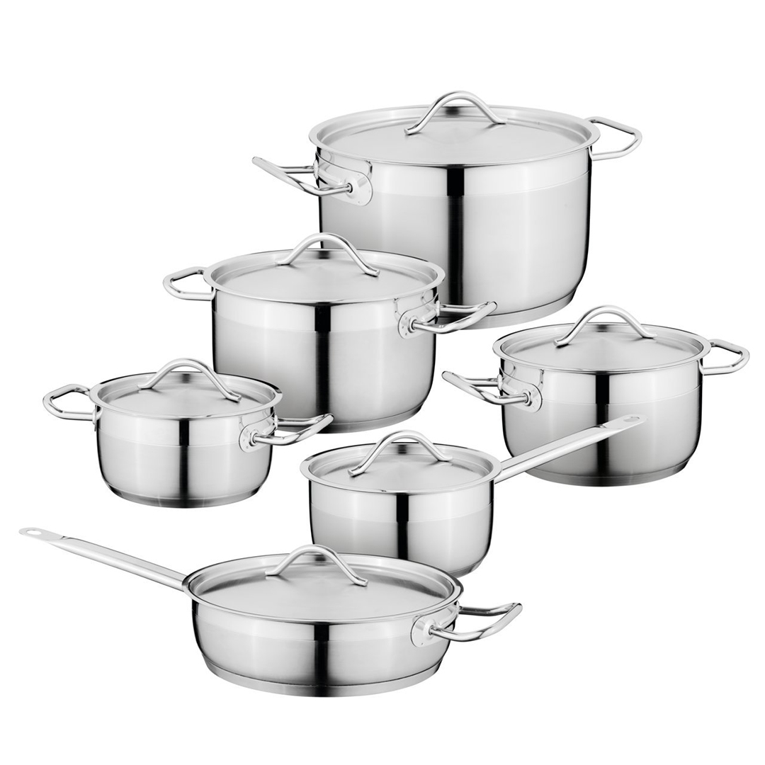 Ein umfassendes, professionelles Topf- und Pfannenset für den intensiven Gebrauch. Das Set umfasst alle wichtigen Geschirrgrößen, die für die tägliche Zubereitung von Speisen benötigt werden. Aufgrund seiner robusten Konstruktion eignet es sich ideal für den Einsatz in privaten und professionellen Küchen.