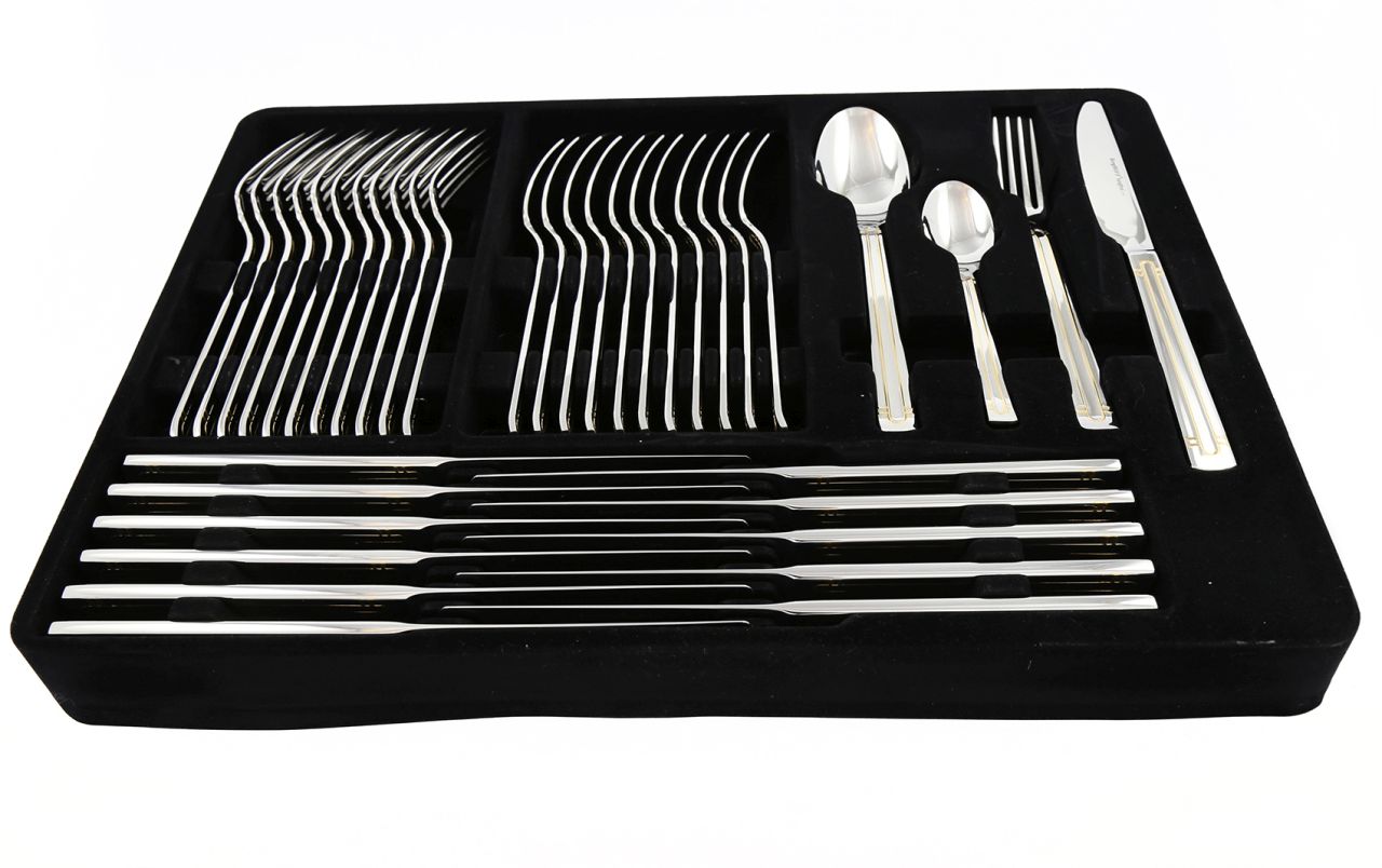 Pilnas 72 dalių stalo įrankių rinkinys, skirtas 12 asmenų. Rinkinyje yra visi įmanomi įrankiai – nuo pagrindinių iki serviravimo – reikalingi prabangiam stalo serviravimui. Idealiai tinka kaip vestuvių, įkurtuvių ar kitos svarbios progos dovana.