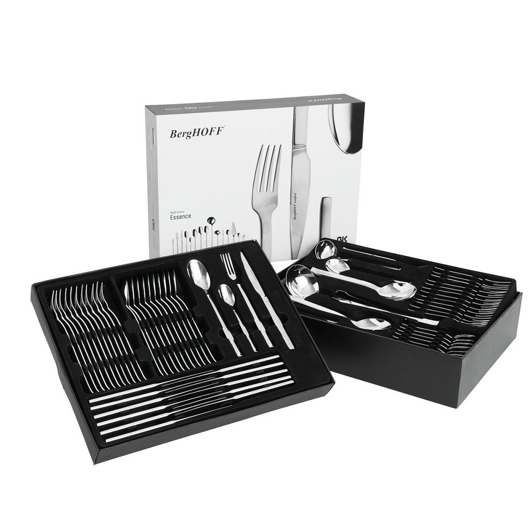 Wir präsentieren BergHOFF “Essence” – ein umfassendes und luxuriöses Besteckset, das Ihren Tisch schmücken und jede Feier unvergesslich machen wird. Es ist ein komplettes 72-teiliges Set für 12 Personen, das nicht nur das Basisbesteck, sondern auch eine breite Auswahl an Servierbesteck umfasst. Alles ist ordentlich und solide in einem eleganten Koffer verstaut.
