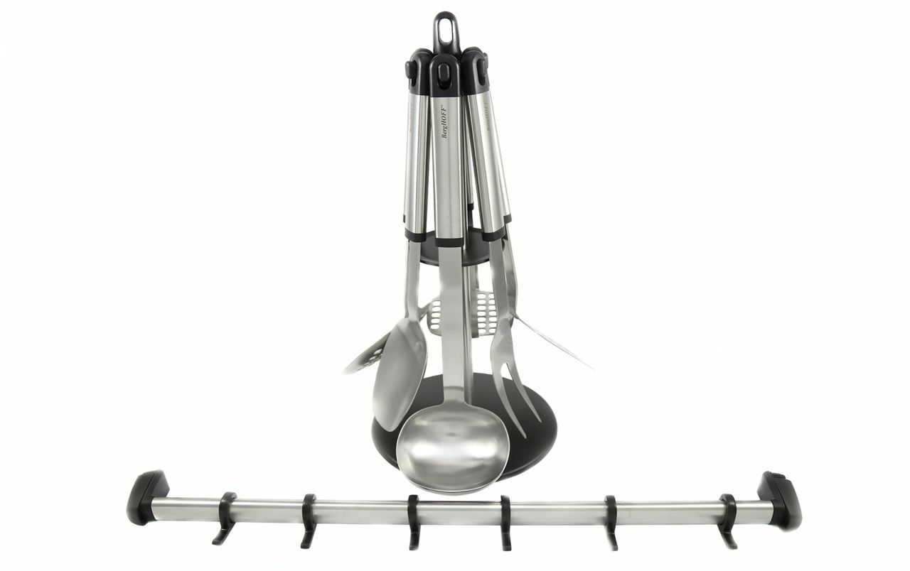 - Das Set beinhaltet: Drehbarer Ständer, Fleischgabel, Kartoffelstampfer, Schöpfkelle, Schaumlöffel, Servierlöffel, Pfannenwender.