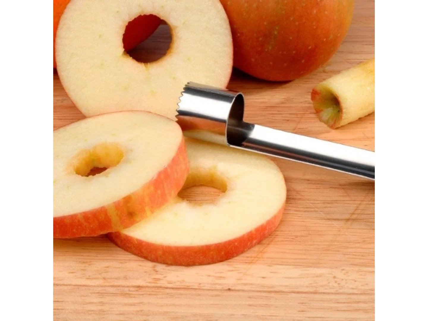- Drücken Sie das Werkzeug nach unten und drehen Sie es, bis es den Apfel vollständig durchdrungen hat.