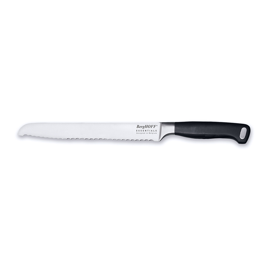 Langes, 23 cm langes Spezialmesser zum Schneiden aller Arten von Brot und Gebäck. Die extrem scharfe, gezahnte Klinge durchtrennt mühelos die harte Kruste, ohne das Innere zu quetschen oder zu zerbröseln. Ideal zum Schneiden von Kuchen, Brötchen oder großen Früchten mit harter Schale.