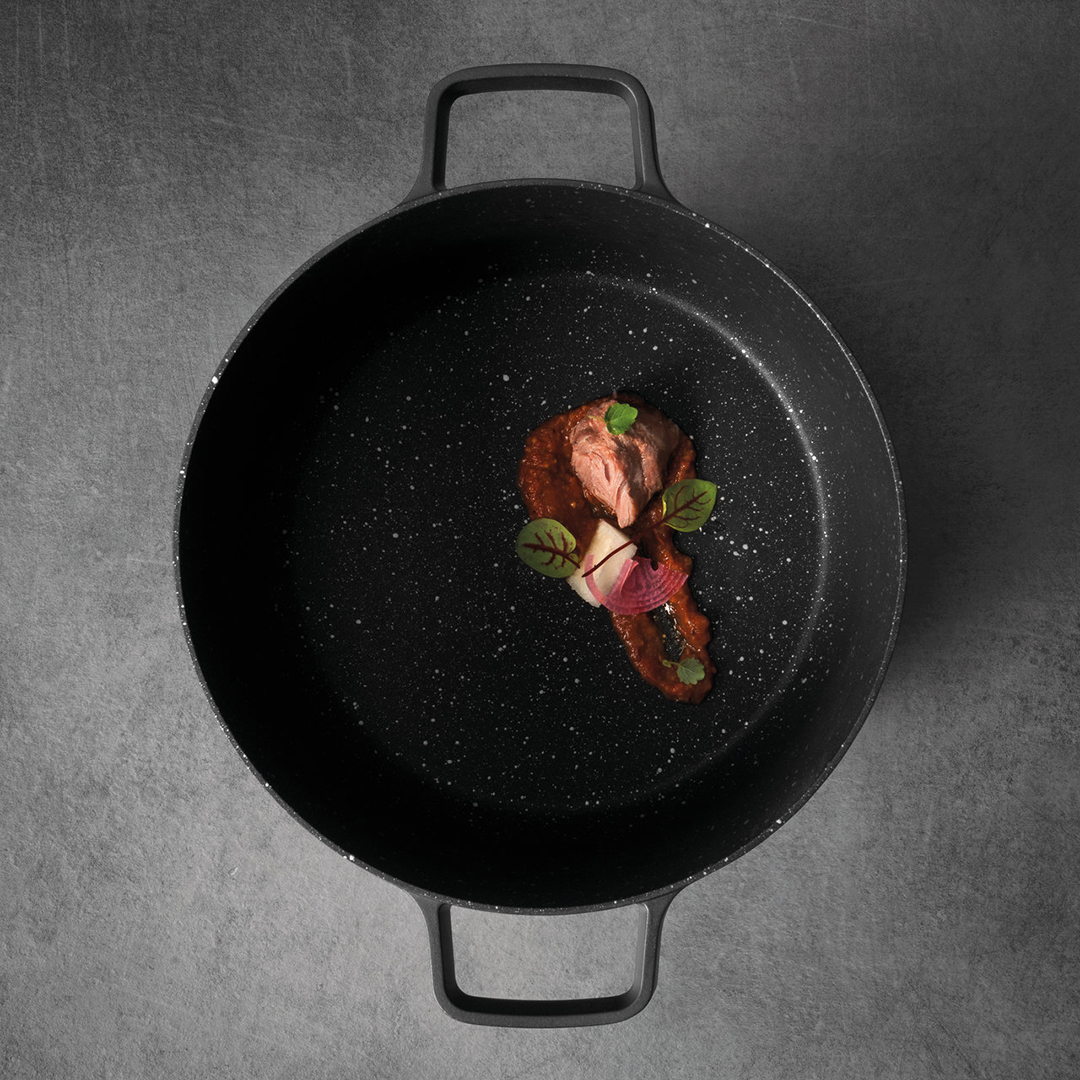 Große, tiefe und vielseitige Brat- und Schmorpfanne mit ofenfesten Griffen. Zum Braten, Schmoren und Kochen größerer Mengen von Speisen auf allen Herdarten und im Ofen.