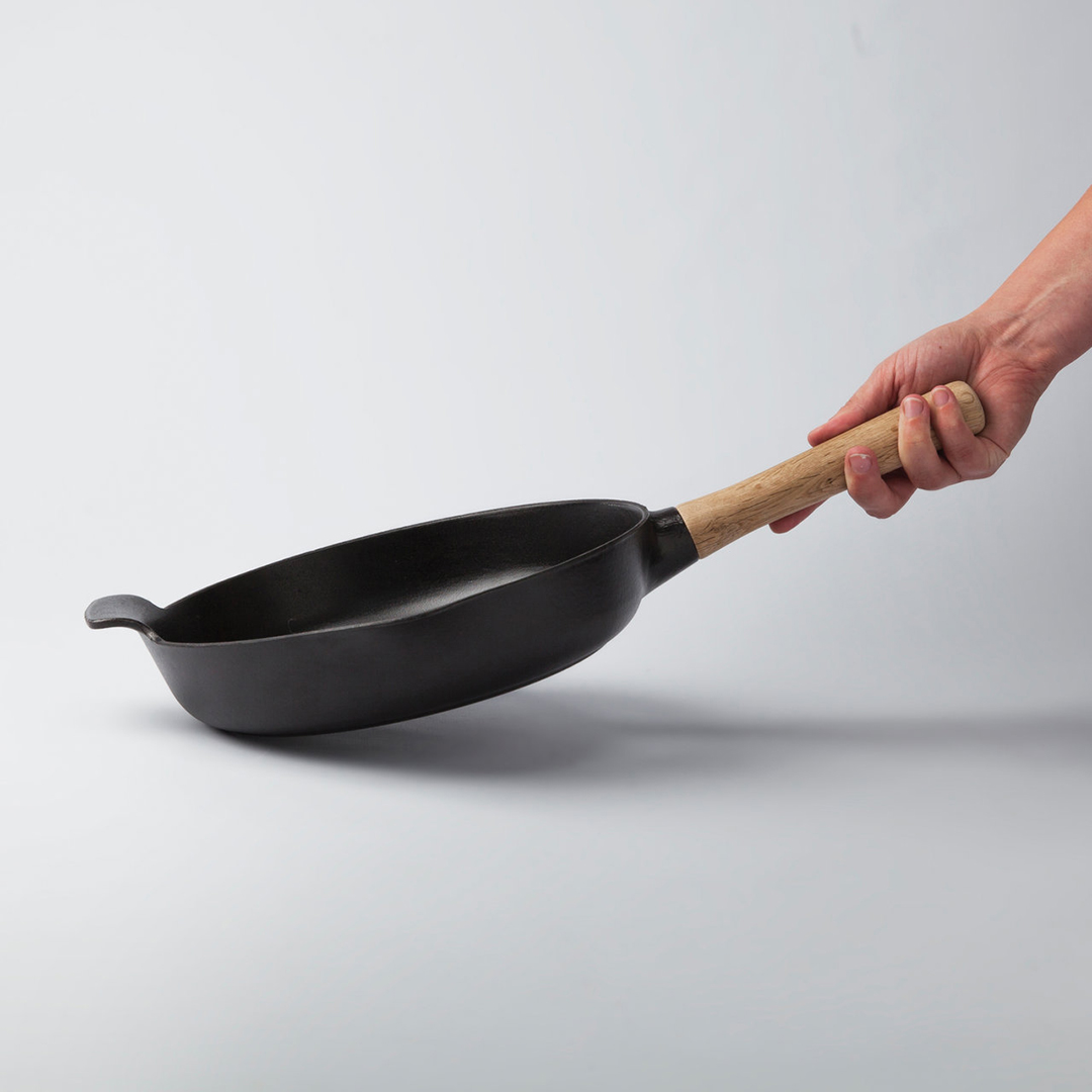Ist die Pfanne sehr schwer? Ja, wie alle Gusseisengefäße ist sie schwer (ca. 3 kg). Gerade die hohe Masse ermöglicht es ihr, Wärme zu speichern und zu halten, was für ein hochwertiges Garergebnis unerlässlich ist.