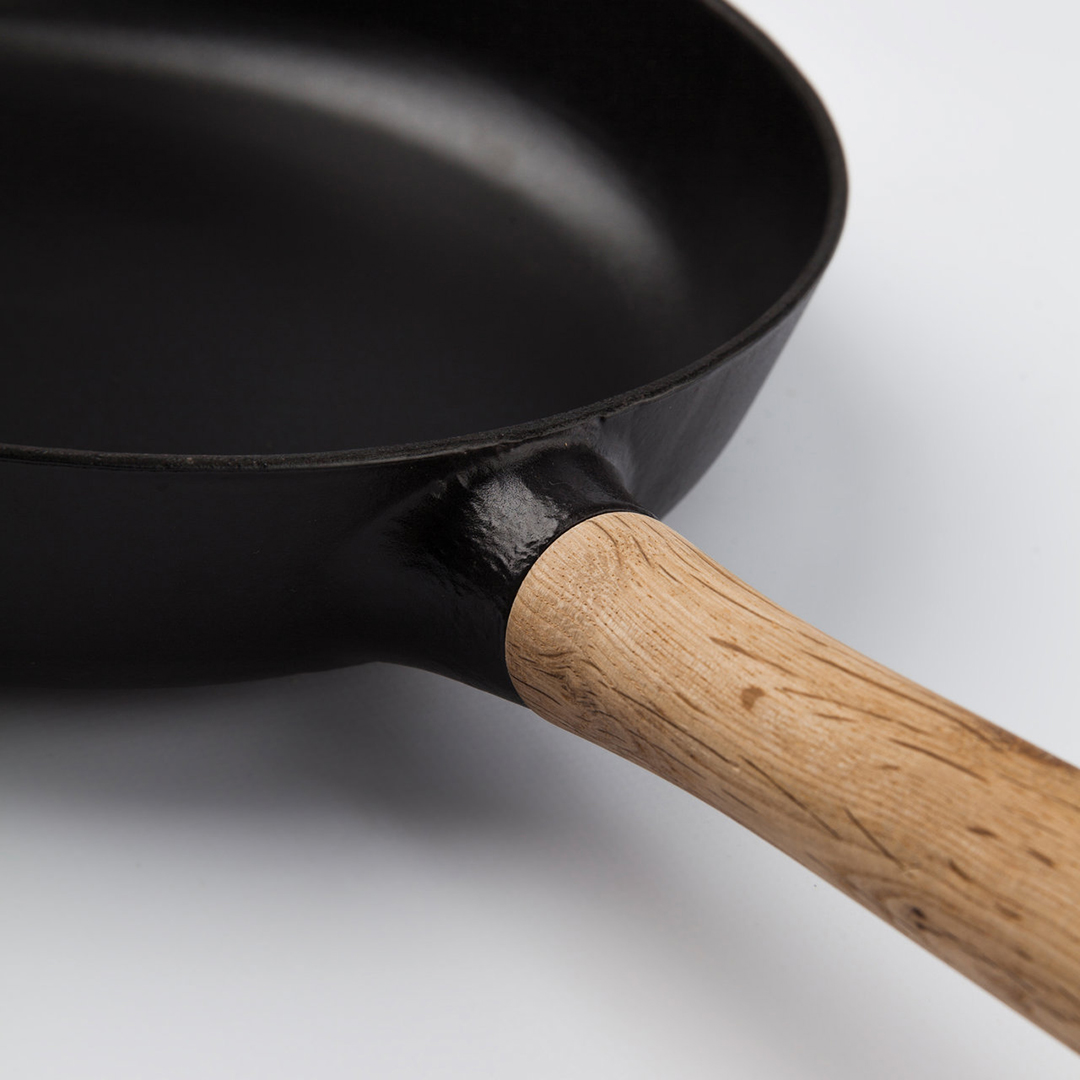- Langlebige Emaillebeschichtung: Die Innen- und Außenseite der Pfanne sind mit einer haltbaren schwarzen Emaille beschichtet. Diese Beschichtung schützt das Gusseisen vor Rost, erleichtert die Reinigung und erfordert im Gegensatz zu traditionellen Gusseisenpfannen keine besondere Pflege oder Vorbereitung (Einbrennen).