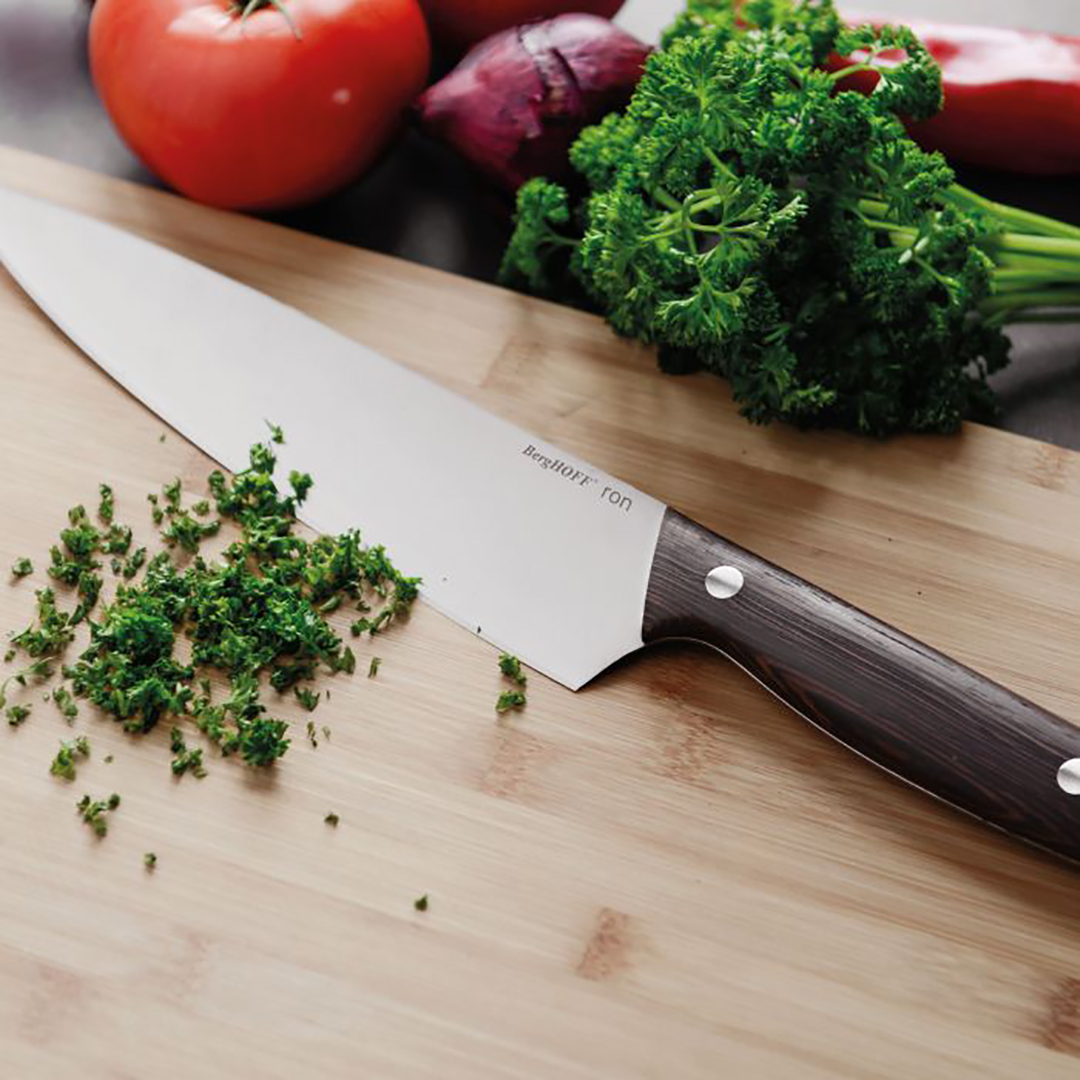 Die BergHOFF “Ron” Serie ist ein preisgekröntes Design, das natürliche Materialien und professionelle Funktionalität vereint. Dieses Kochmesser ist nicht nur ein einwandfreies Werkzeug, sondern auch ein atemberaubendes Küchenaccessoire. Die kontrastreiche Kombination aus schwarzer Klinge und warmem Holzgriff wurde für diejenigen geschaffen, die Ästhetik und Qualität schätzen.