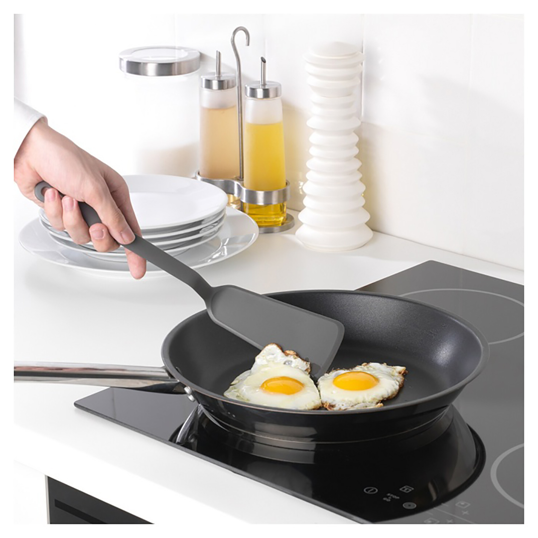 Vielseitiges Küchenwerkzeug zum Wenden von gebratenen Speisen, zum Mischen, zum Umfüllen von Zutaten und zum Servieren. Besonders geeignet für die Verwendung mit Antihaft-beschichteten (Teflon-) Kochgeschirr aufgrund der sanften Silikon-Arbeitsfläche.