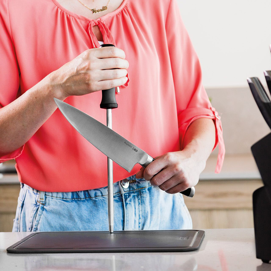 Selbst die besten und robustesten Messer verlieren mit der Zeit ihre makellose Schärfe. Eine regelmäßige Pflege der Klingen mit einem Wetzstahl ist unerlässlich, um ein leichtes und sicheres Schneiden zu gewährleisten. Der BergHOFF “Graphite” Wetzstahl ist ein professionelles Werkzeug, das entwickelt wurde, um die Klingen Ihrer Küchenmesser einfach und schnell zu Hause wiederherzustellen und zu erhalten.