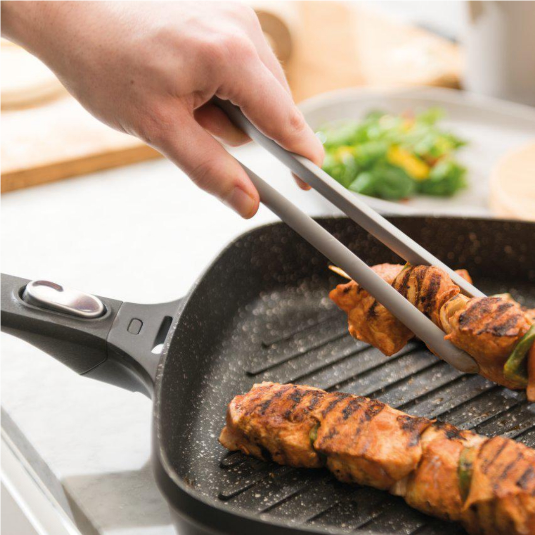 - Fester und sicherer Halt: Spezielle gezahnte Zangenkanten sorgen für einen zuverlässigen Halt der Speisen – vom glatten Hähnchenstück bis zum kleinen Gemüse. Die ergonomischen Griffe liegen bequem in der Hand und sind rutschfest.