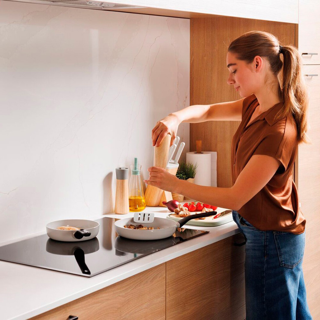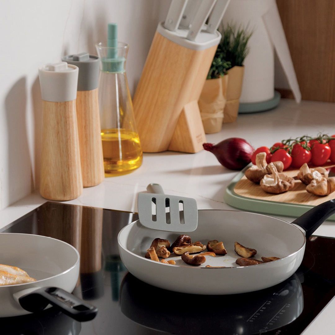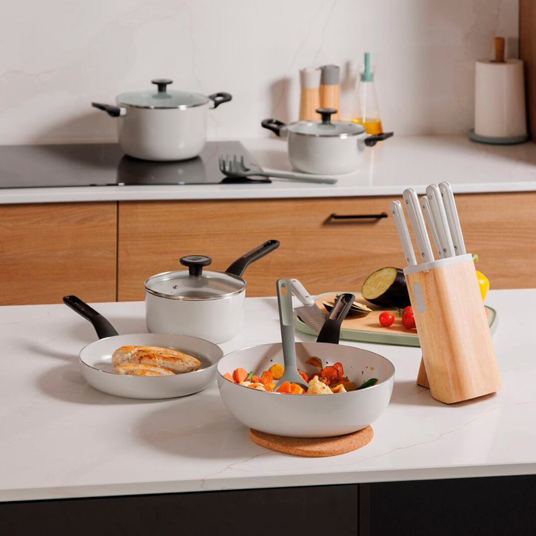 Die Glints Spirit-Serie des belgischen Herstellers BergHOFF ist eine Mischung aus hervorragender ökologischer Verträglichkeit, Funktionalität und minimalistischem Design. Der gegossene Aluminiumkörper sorgt für eine schnelle Aufheizung und gleichmäßige Wärmeverteilung, was Kochen und Reinigen erleichtert. Wir empfehlen Handwäsche und die Verwendung von nicht-metallischen (Polypropylen, Silikon, Holz) Küchenutensilien, um die Antihaftbeschichtung nicht zu beschädigen.