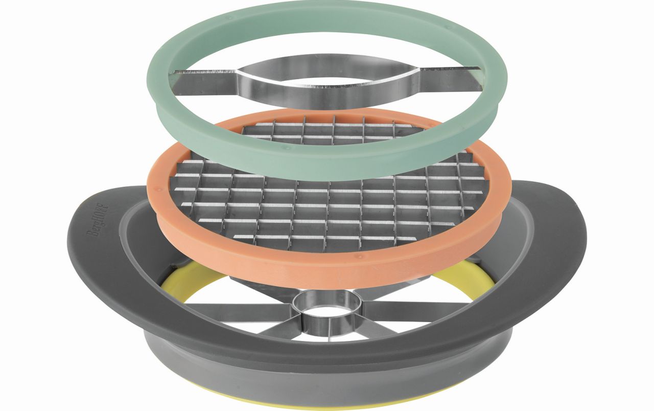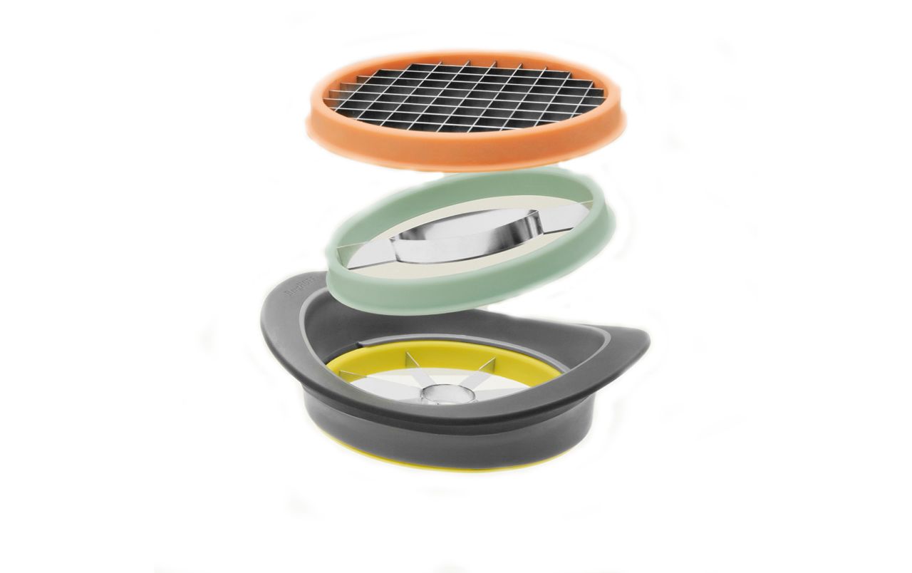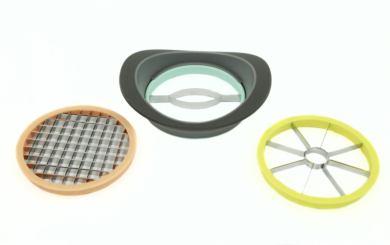 Kompaktes, multifunktionales 3-in-1-Schneideset mit austauschbaren Klingeneinsätzen. Entwickelt für die schnelle und sichere Zubereitung von Obst und Gemüse in verschiedenen Formen (Spalten, Hälften, Stifte).