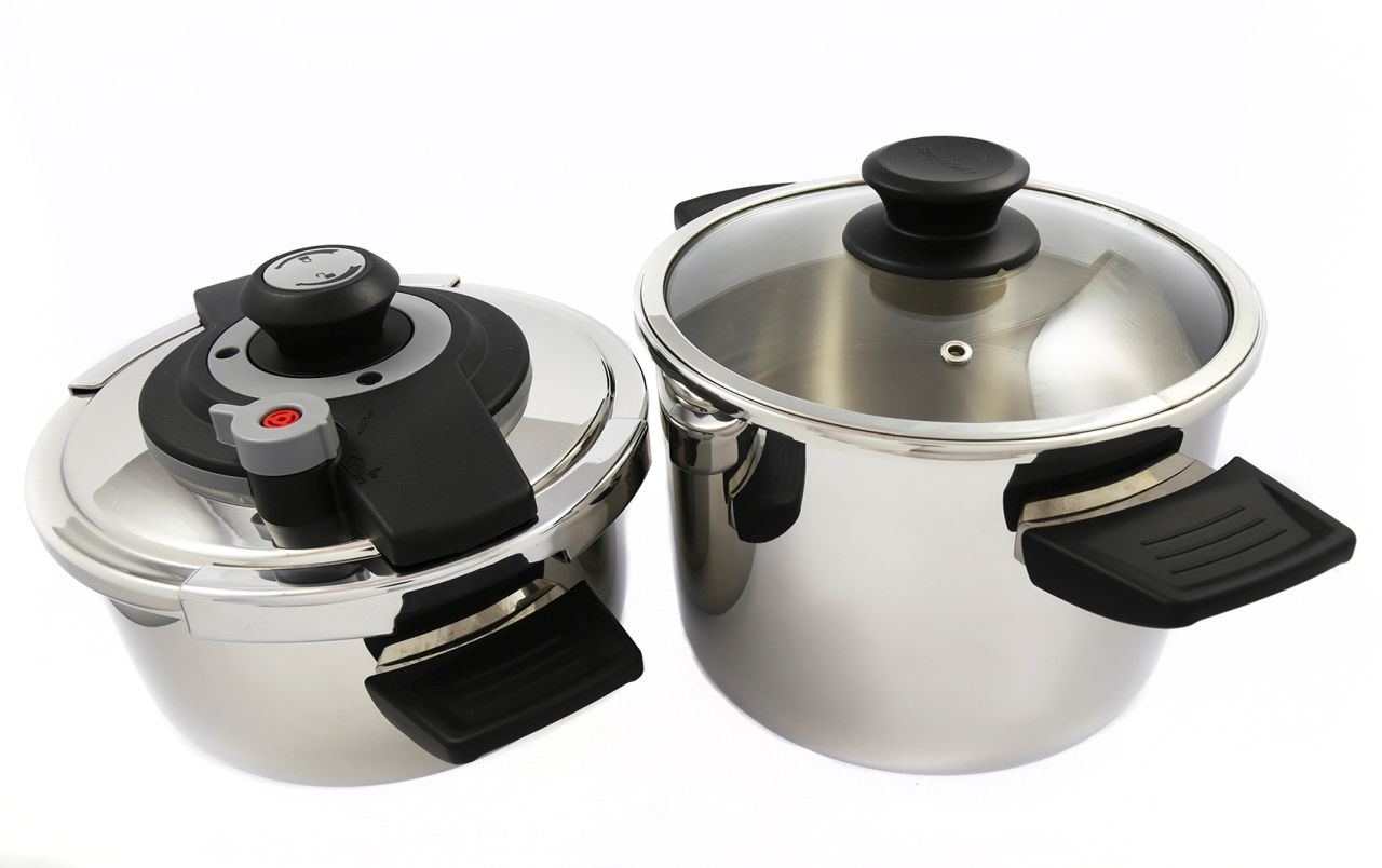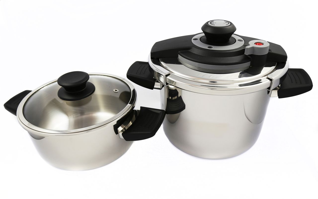 Das Set enthält einen universellen Schnellkochtopfdeckel, der für beide Töpfe geeignet ist, und einen zusätzlichen Glasdeckel, mit dem die Töpfe als normale Schmortöpfe verwendet werden können.