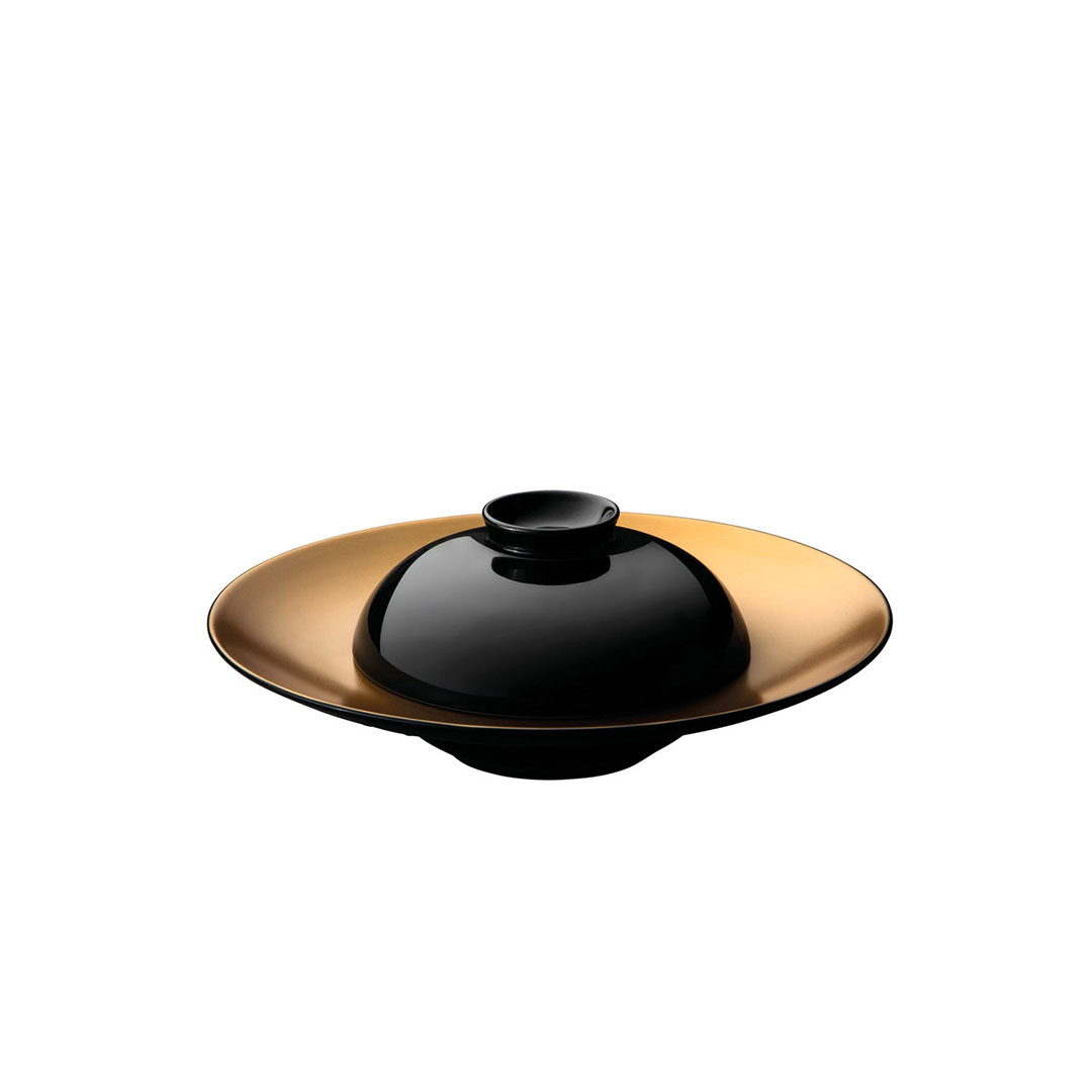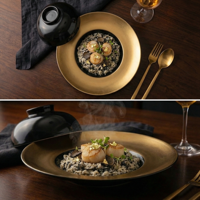 - Beeindruckendes Design: Tiefschwarzes Porzellan ist der perfekte Hintergrund, um die Farben und Texturen der Gerichte hervorzuheben, während der Goldstreifen einen Hauch von Luxus verleiht. Es ist eine kühne und moderne Wahl, die tadellosen Geschmack widerspiegelt.