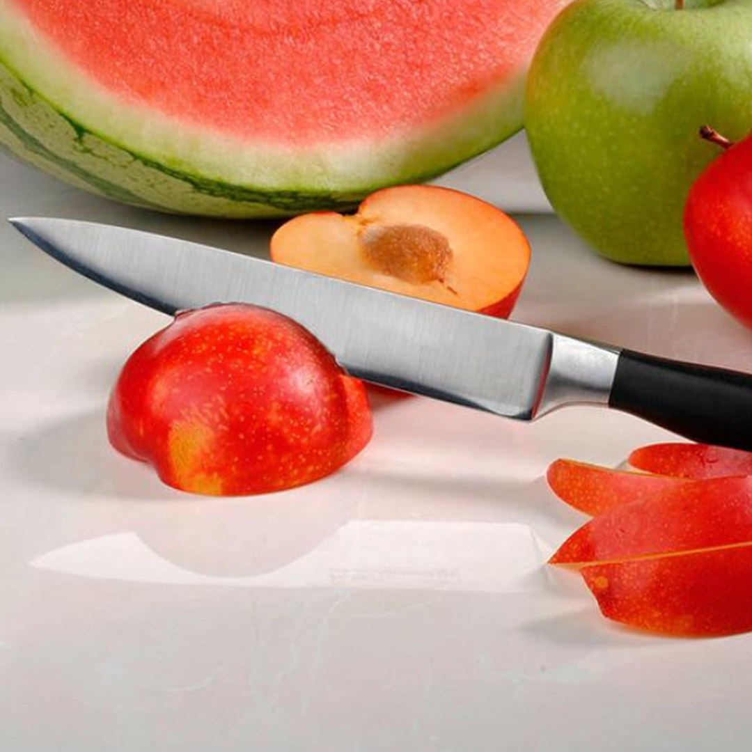- Es eignet sich hervorragend zum Schneiden von Produkten, die zu groß für ein Schälmesser, aber zu klein für ein großes Kochmesser sind: z. B. Gurken, Tomaten, Käse oder kleine Fleischstücke.