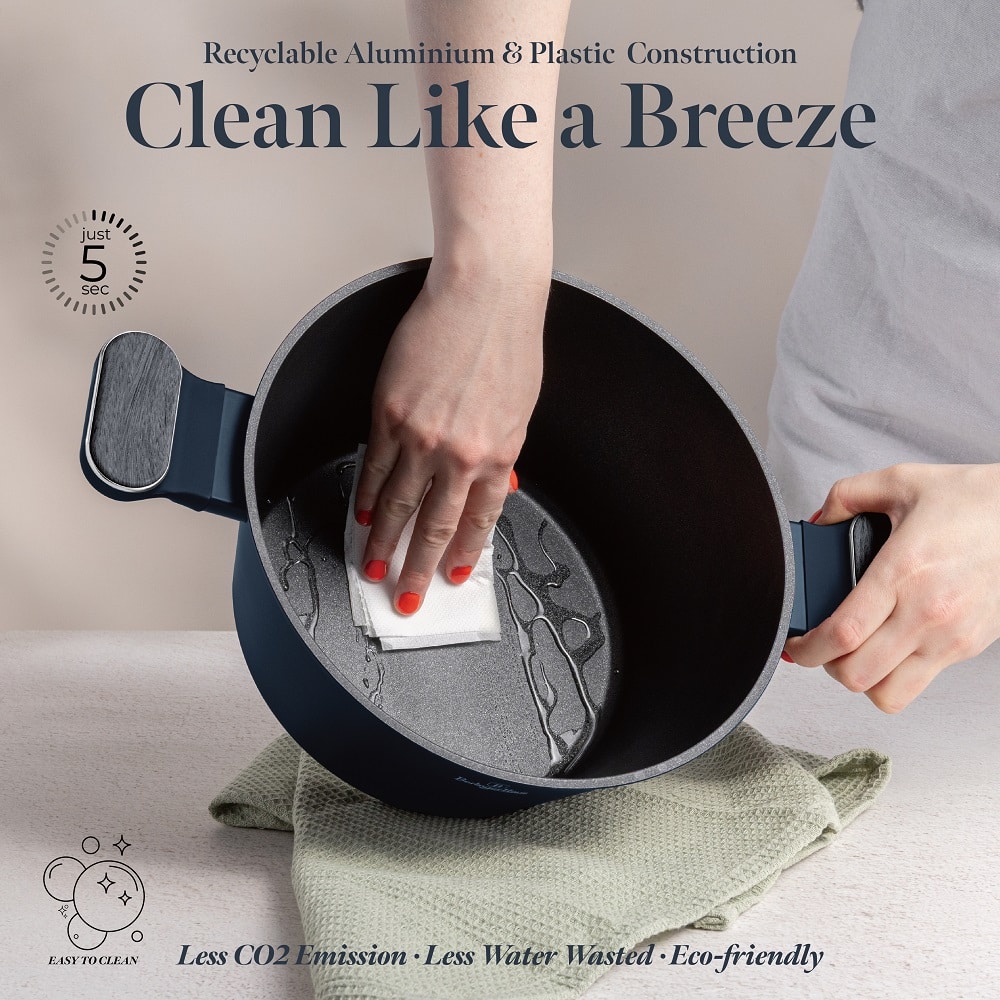 Das Geschirr ist aus hochwertigem, geschmiedetem Aluminium gefertigt und mit einer fortschrittlichen 3-lagigen TitanPro-Beschichtung versehen. Sie zeichnet sich durch besondere Kratzfestigkeit, Langlebigkeit aus und ermöglicht das Kochen mit minimaler Fettmenge. Die Speisen bleiben nicht haften und die Reinigung des Geschirrs ist denkbar einfach.