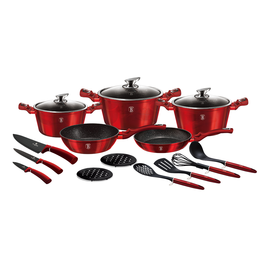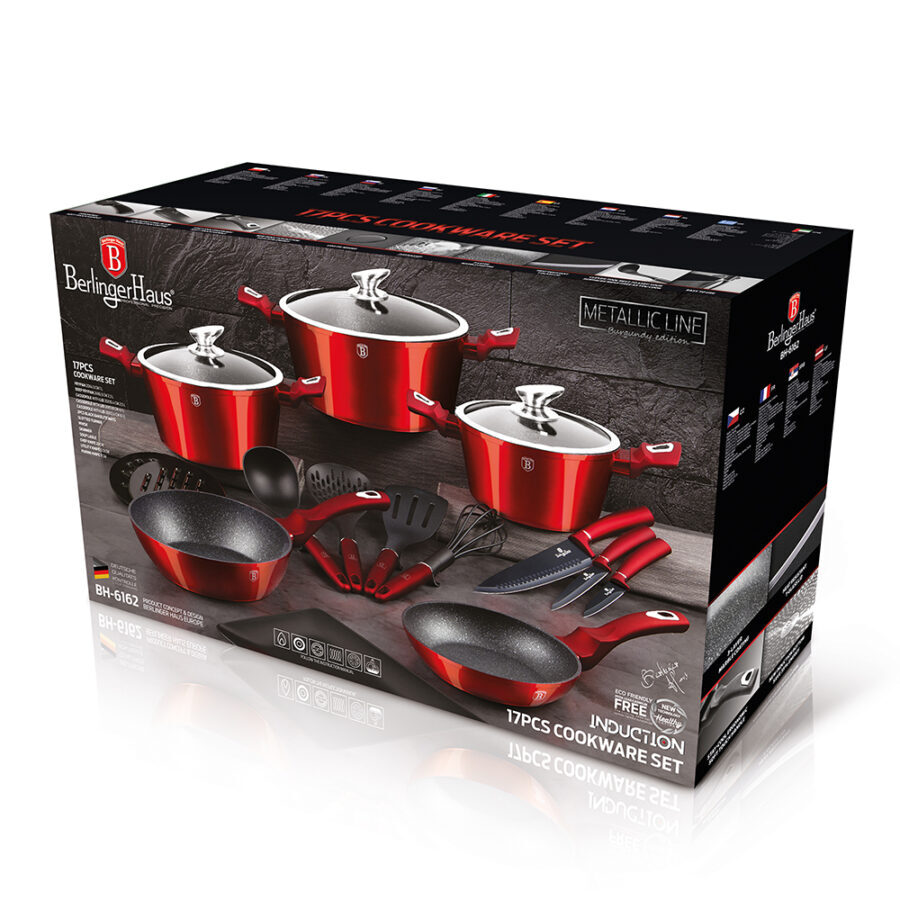 Werten Sie Ihre Küche mit dem beeindruckenden 17-teiligen Set aus der beliebtesten “Metallic Line Burgundy”-Kollektion von “Berlinger Haus” auf. Dieses Set zeichnet sich durch eine satte, metallische rote Farbe aus, die zu einem markanten und eleganten Akzent in Ihrer Küche wird. Es sind nicht nur Geschirr – es ist eine vollwertige Lösung zum Kochen, Schneiden und Servieren.