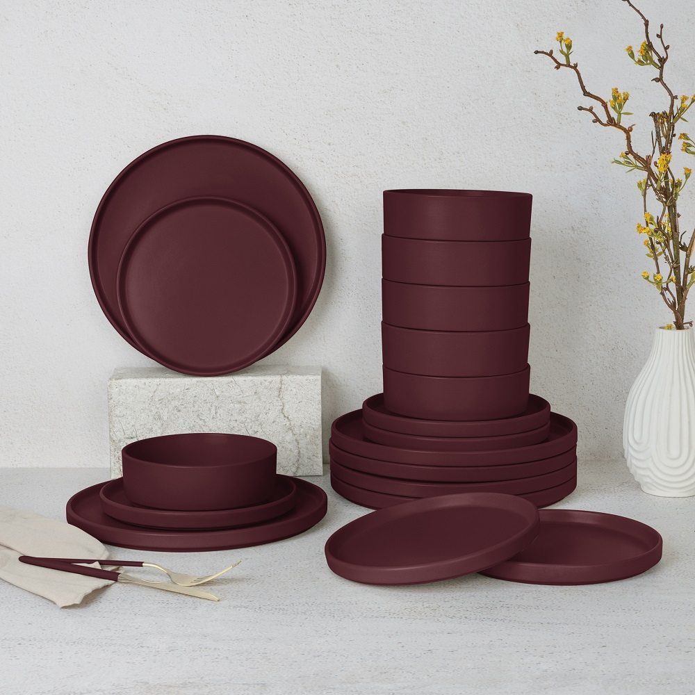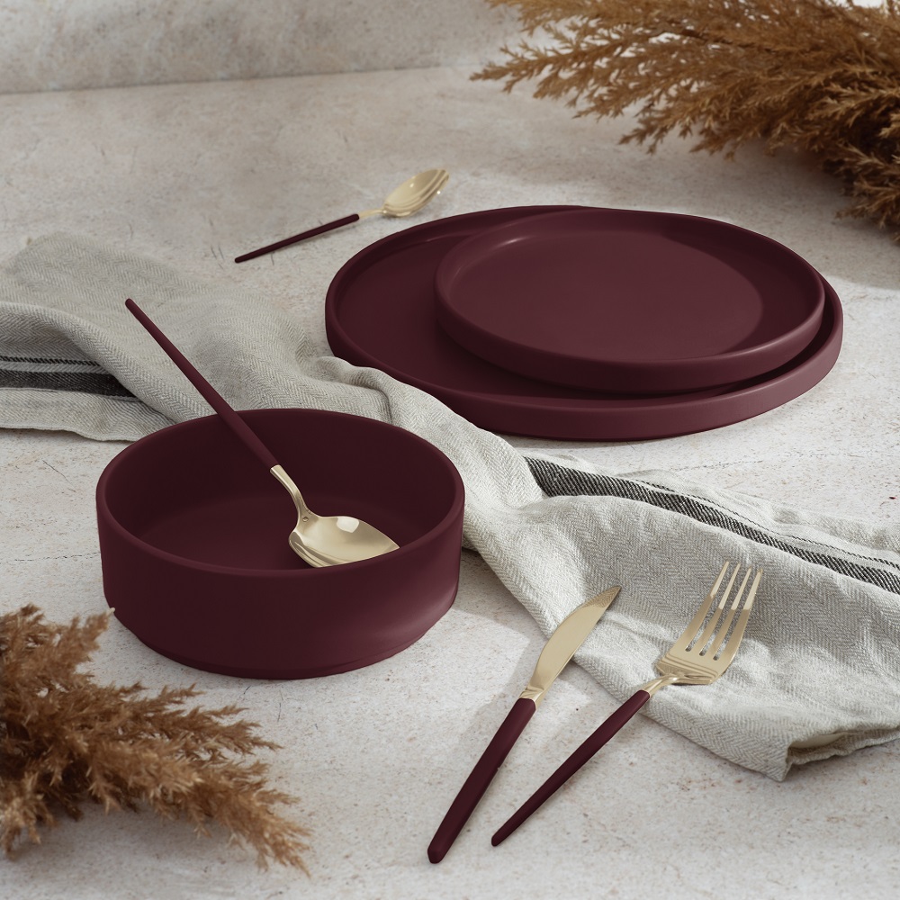 Jedes Setteil besteht aus hochwertigem Steinporzellan, das nicht nur eine langfristige Nutzung garantiert, sondern auch einen außergewöhnlichen ästhetischen Effekt bietet. - Mattes Bordeauxrot: