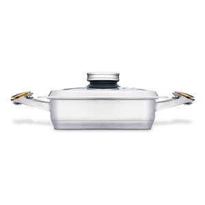 - Körper der Quadra Schmorpfanne: Die Wände der Schmorpfanne sind etwas weniger als 1 Millimeter dick, sie erhitzen sich viel langsamer als der Topfboden. Dadurch wird sichergestellt, dass die heiße Luft im Inneren des Kochgeschirrs kondensiert, wenn sie den Deckel erreicht, wodurch der Dampf entsteht, der beim Kochen im geschlossenen Kreislauf zuerst entsteht. Daher werden Lebensmittel bei schwacher Hitze bei einer konstanten Temperatur unterhalb des Siedepunktes gegart.
