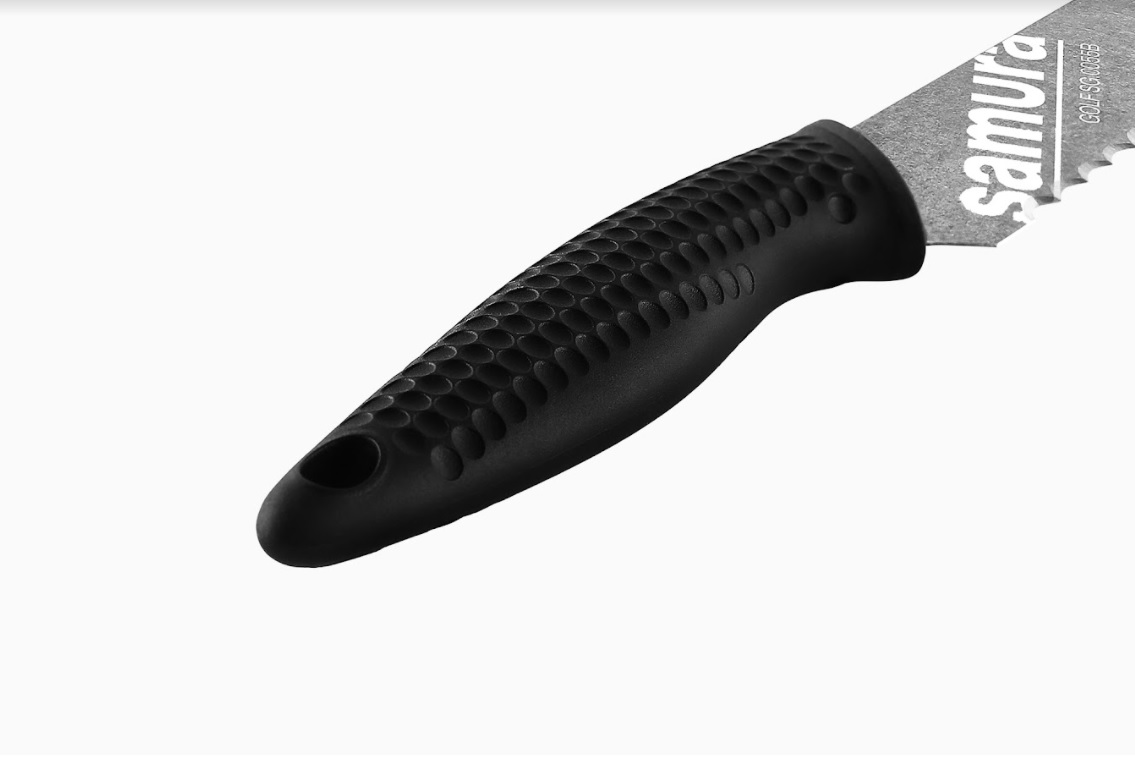 Das Küchenbrotmesser aus der Samura Golf Kollektion mit Wellenschliff ist ein tolles Werkzeug zum effizienten Schneiden verschiedenster Backwaren (Brot, Kuchen, Torten).