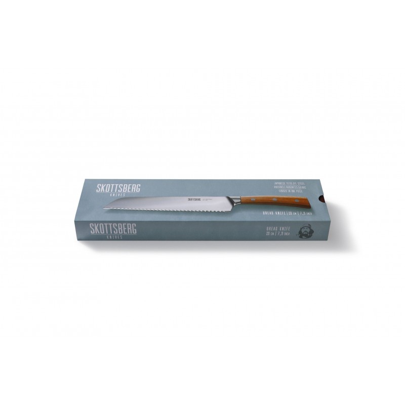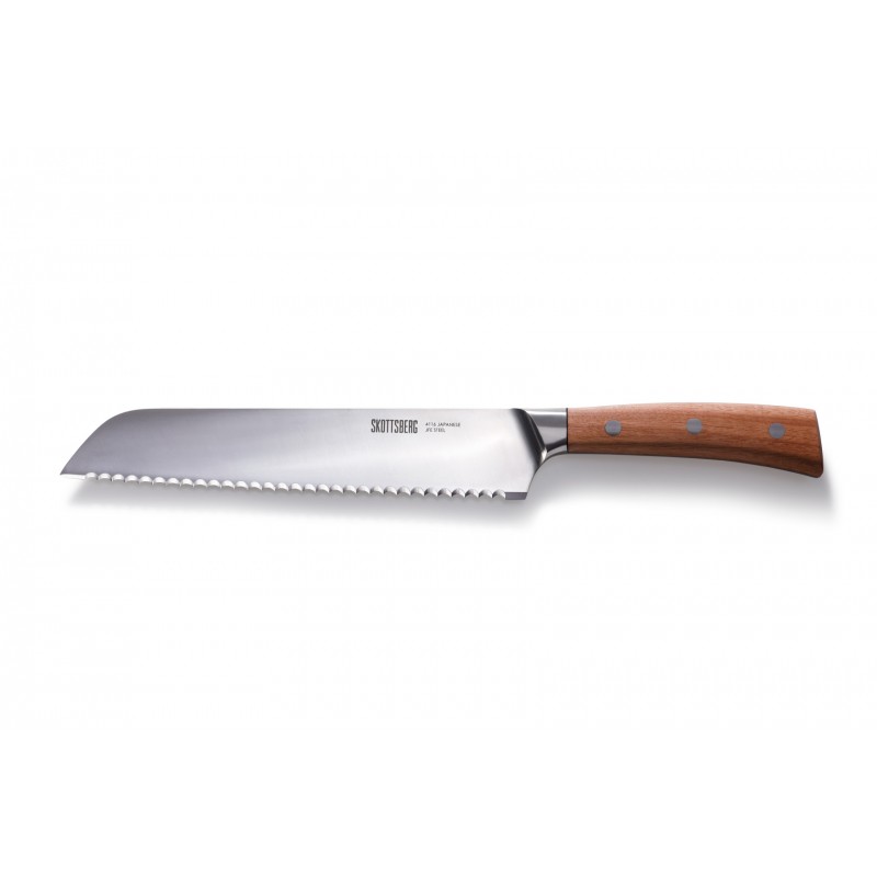 Das Skottsberg Brotmesser ist für diejenigen gemacht, die Qualität schätzen. Die Klinge ist aus hochwertigem japanischem 4116 JFE-Stahl gefertigt, der auch bei intensivem Gebrauch scharf und robust bleibt. Die gezackte Klinge hilft, harte Krusten leicht zu durchdringen, ohne die weiche Struktur des Gebäcks zu beschädigen.
