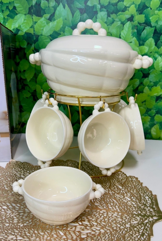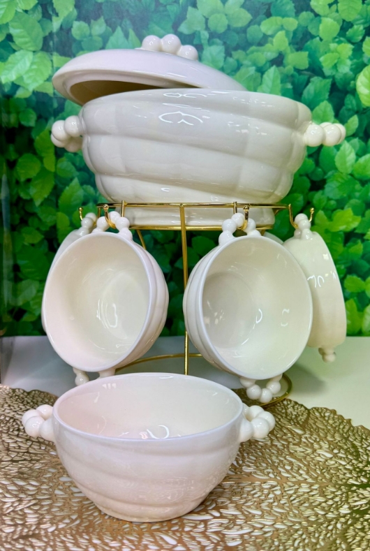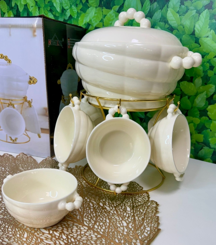 - ✅ Komplettes Set: Suppenschüssel, 6 Schalen und ein eleganter goldfarbener Ständer.