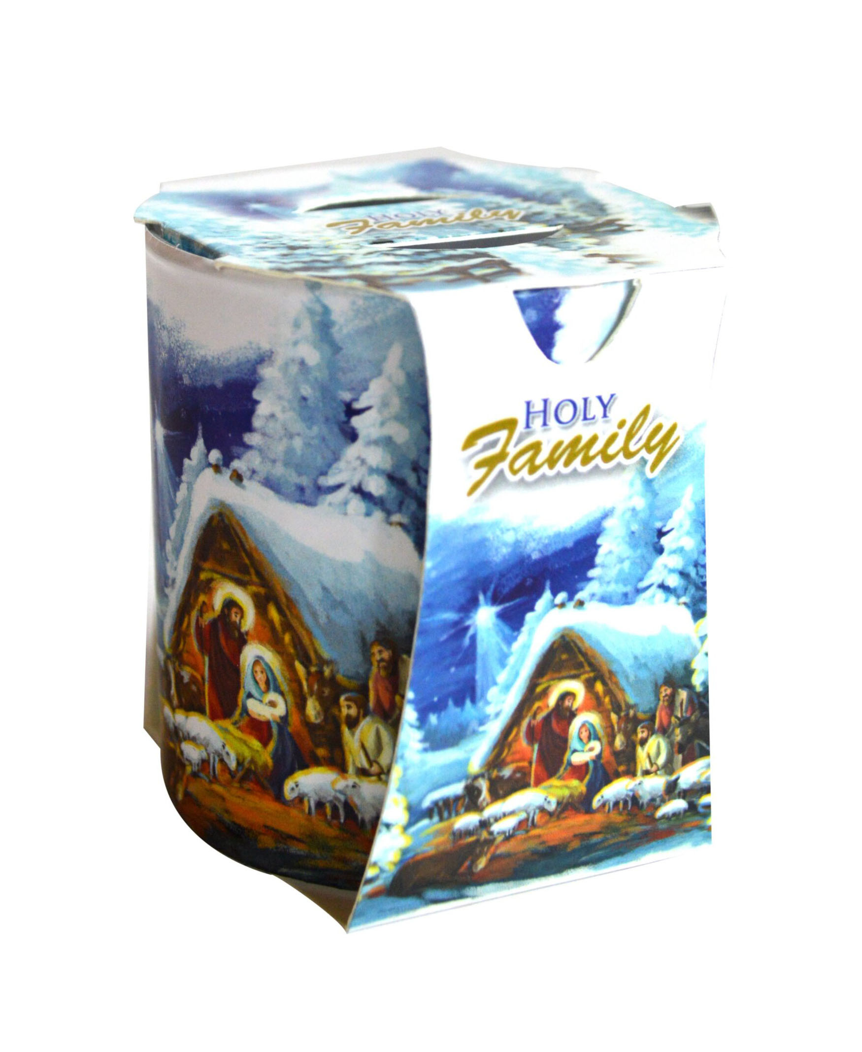 Aromatische und dekorative Kerze im Glasgefäß mit Abbildung der Heiligen Familie. Entwickelt, um eine spirituelle und gemütliche Atmosphäre während der Advents- und Weihnachtszeit zu schaffen. Geeignet für die Dekoration zu Hause oder als symbolisches Geschenk.