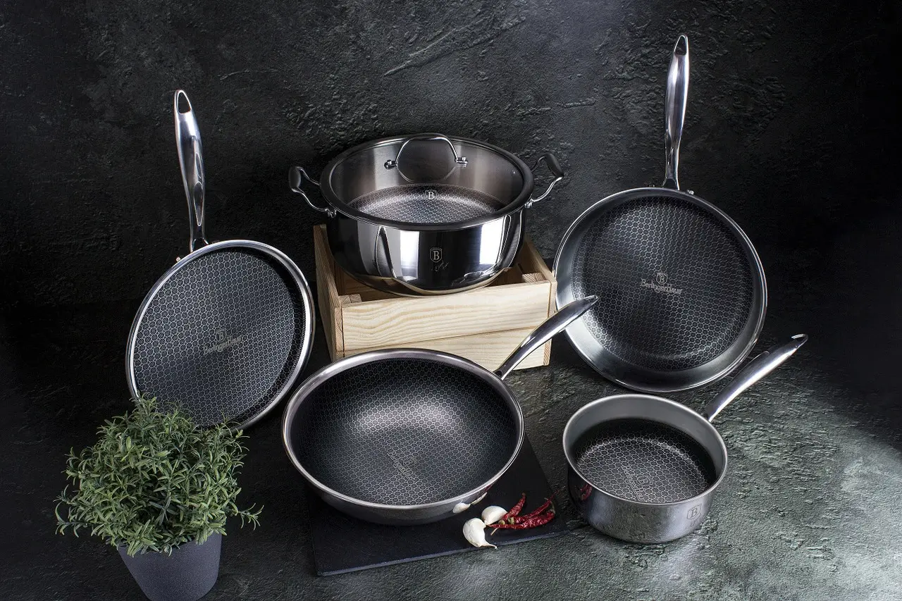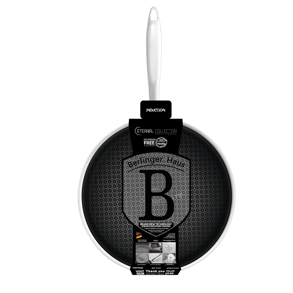 Die Eternal Collection ist die Geschirrlinie von Berlinger Haus mit innovativer 3D-Beschichtung. Die Pfannen bestehen aus Edelstahl 18/10. Sie verfügen über einen akuthermischen 3-Schicht-Boden, der die Wärme perfekt sammelt und gleichmäßig über die gesamte Oberfläche der Schüssel verteilt. Die 3D-Beschichtung wird in Form eines Wabengitters aufgetragen. Diese Beschichtung ist äußerst langlebig und kratzfest. Dadurch können Sie mit einem Minimum an Fett braten und kochen. Lebensmittel brennen auch beim Garen bei hohen Temperaturen nicht an. Das Sortiment ist für alle Herdarten geeignet – darunter Gas, Elektro, Ceran und Induktion. Die Beschichtung ist fünfmal stärker als Teflon- und Granitbeschichtungen. Dadurch halten die Gerichte viele Jahre lang, ohne ihre Eigenschaften zu verlieren. Ihr unbestrittener Vorteil ist die einfache Reinigung. Geschirr kann in der Spülmaschine gespült werden.