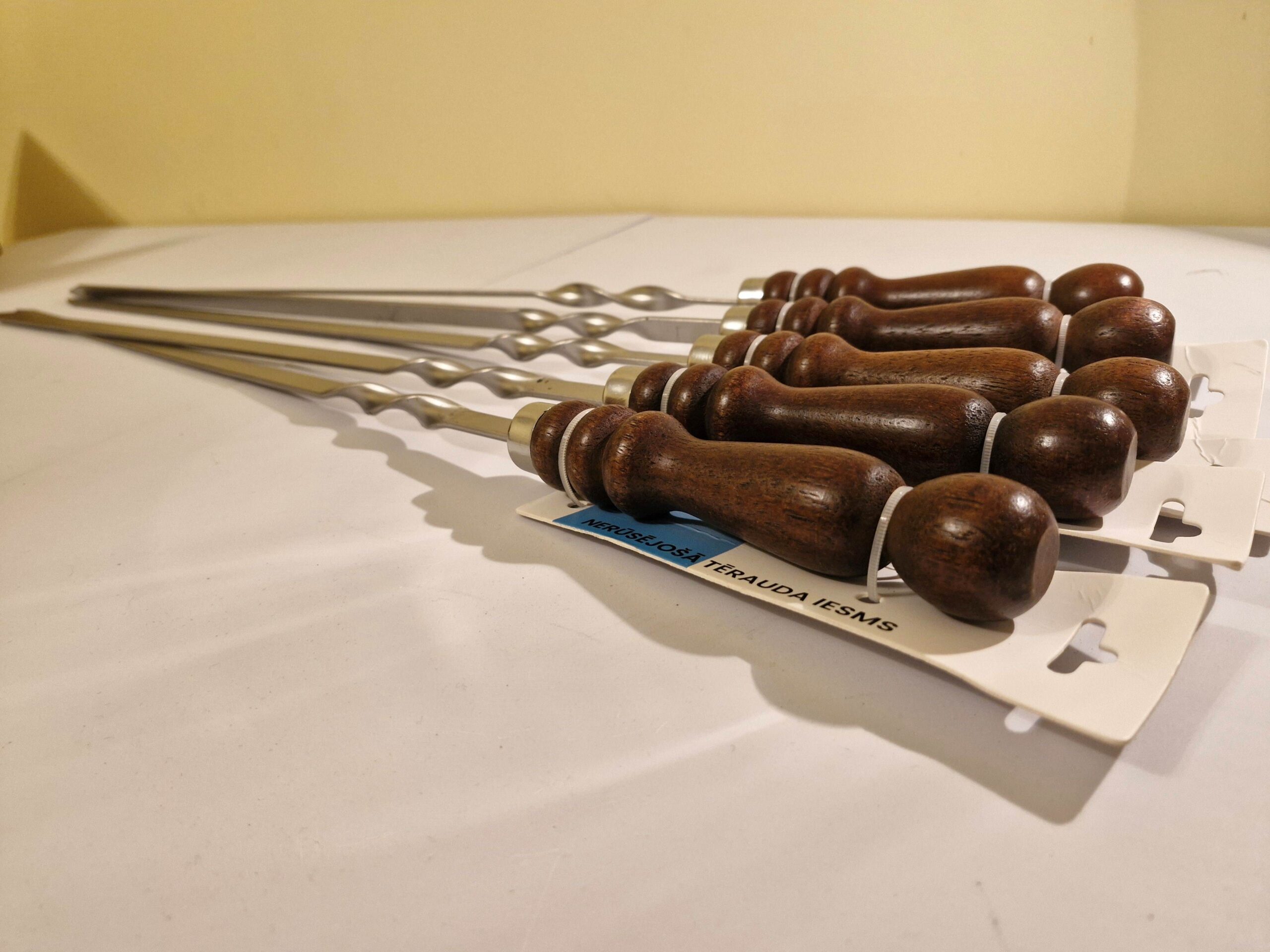 Der ergonomische Griff aus dunklem Holz verleiht dem Produkt nicht nur ein ästhetisches Aussehen, sondern sorgt auch für Sicherheit. Das Holz erwärmt sich langsam, sodass Sie die Spieße bequem ohne zusätzliche Handschuhe wenden können. Ein spiralförmiges Element an der Basis des Griffs stabilisiert den Spieß zusätzlich in den Grillrillen und gibt Ihnen die volle Kontrolle über den Garprozess.