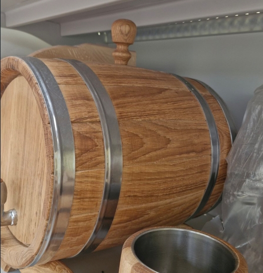 Das Fass wird aus sorgfältig ausgewähltem, natürlichem Eichenholz mit einer dichten Struktur hergestellt. Es ist fest mit Edelstahlreifen verspannt, was Langlebigkeit und Dichtheit gewährleistet. Im Gegensatz zu vielen dekorativen Fässern ist dieses mit einem zuverlässigen Metallhahn ausgestattet, der haltbarer und ästhetischer als Kunststoff-Analoga ist.