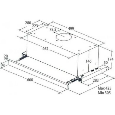 60 cm breite Teleskop-Dunstabzugshaube (ausziehbar) zur Montage im Schrank, zur Absaugung von Dämpfen und Gerüchen. Geeignet für den Betrieb im Abluft- oder Umluftbetrieb.