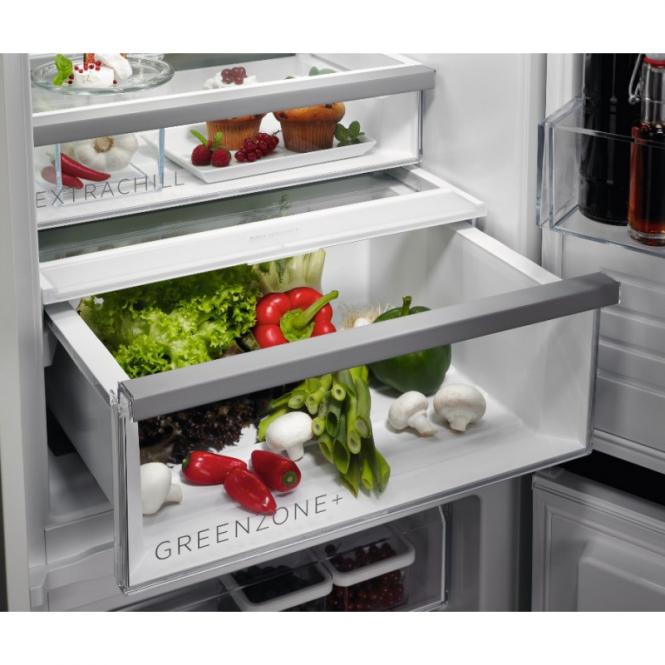 Eine spezielle, luftdichte „GreenZone+“-Schublade hält den idealen Feuchtigkeitsgehalt für Ihr Obst und Gemüse aufrecht. Durch die Beseitigung überschüssiger Feuchtigkeit, ohne dass die Produkte austrocknen, bewahrt diese Schublade ihre Textur, ihren Geschmack und bis zu 95 % der Vitamine auch nach 11 Tagen*.