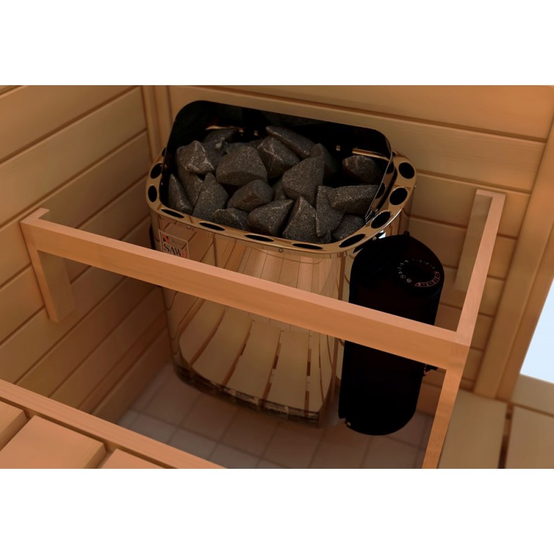Er verhindert, dass die Saunawand stark überhitzt, und leitet die Wärme dorthin, wo sie benötigt wird – in das Innere und den unteren Bereich der Sauna, wodurch Energie gespart und der Komfort erhöht wird.