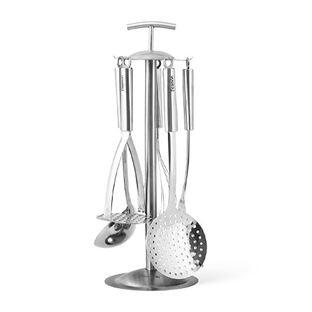 Umfassendes Set mit 5 wichtigen Küchenutensilien mit Ständer. Das Set enthält alles, was Sie für die tägliche Zubereitung von Speisen benötigen: vom Servieren von Suppe bis zum Stampfen von Kartoffeln. Es ist eine perfekte Lösung für alle, die Ordnung in der Küche halten und Werkzeuge immer griffbereit haben möchten.