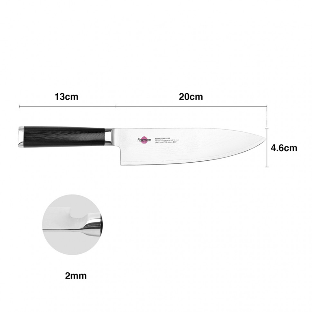Spezifikationen Typ: Kochmesser Marke: Fissman Serie: KENSEI MUSASHI Modell: F-2567 Klingenmaterial: Damaststahl (67 Lagen), VG-10 Kern Klingenhärte: 61 HRC (nach Rockwell) Griffmaterial: G-10 Glasfaser Klingenlänge: 20 cm Schleifwinkel: 15-17° (pro Seite) Schleifmethode: Honbazuke Hersteller: Fissman (Dänemark) Gewicht: ~0.24 kg Verpackungsabmessungen: 40 x 9 x 4 cm