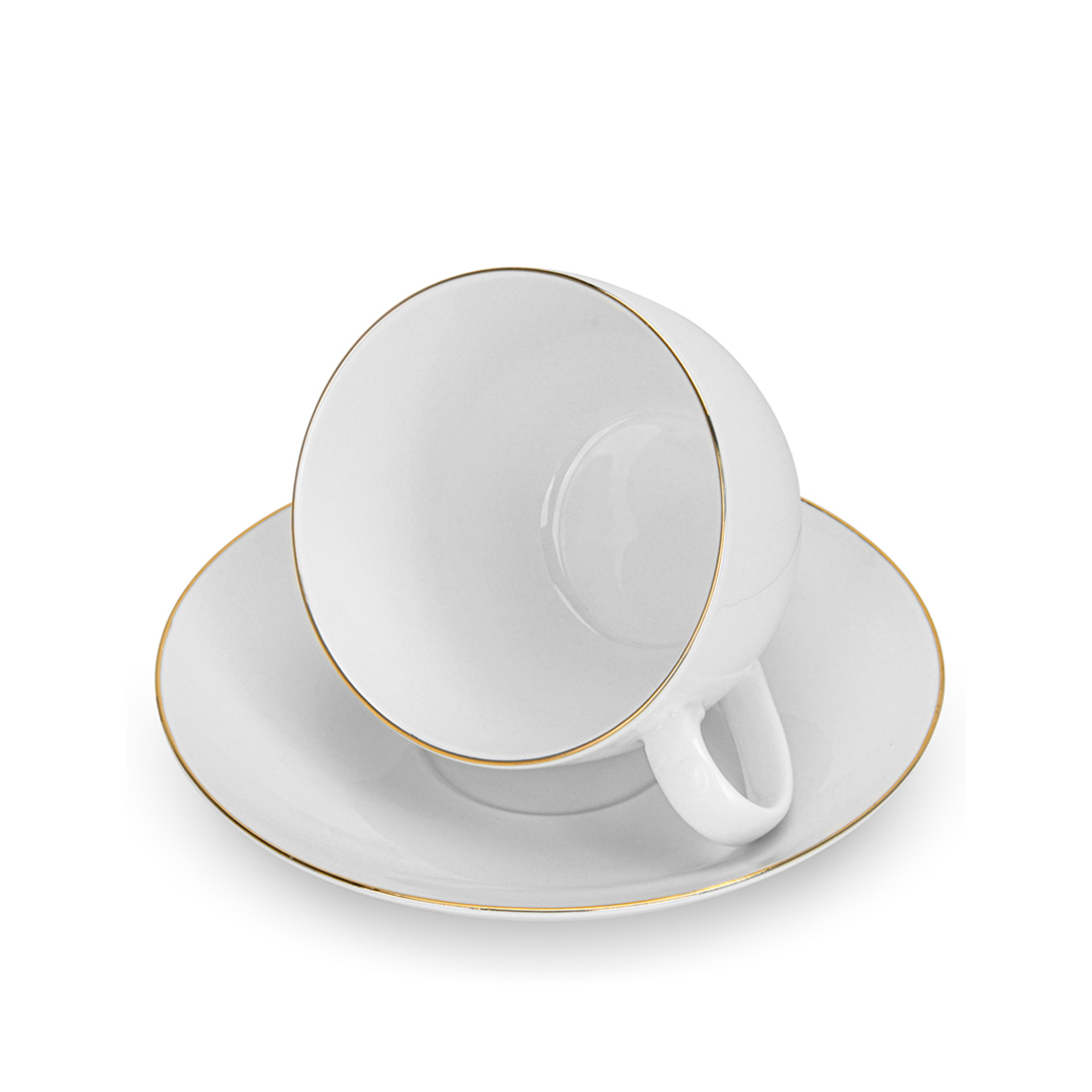 Das Set ist aus hochwertigem, schneeweißem Porzellan gefertigt. Dieses Material wird für seine Festigkeit, Langlebigkeit und Fähigkeit, die Wärme des Getränks länger zu halten, geschätzt. Die glatte, porenfreie Porzellanoberfläche ist hygienisch und leicht zu reinigen und behält ihr ursprüngliches Aussehen über viele Jahre.