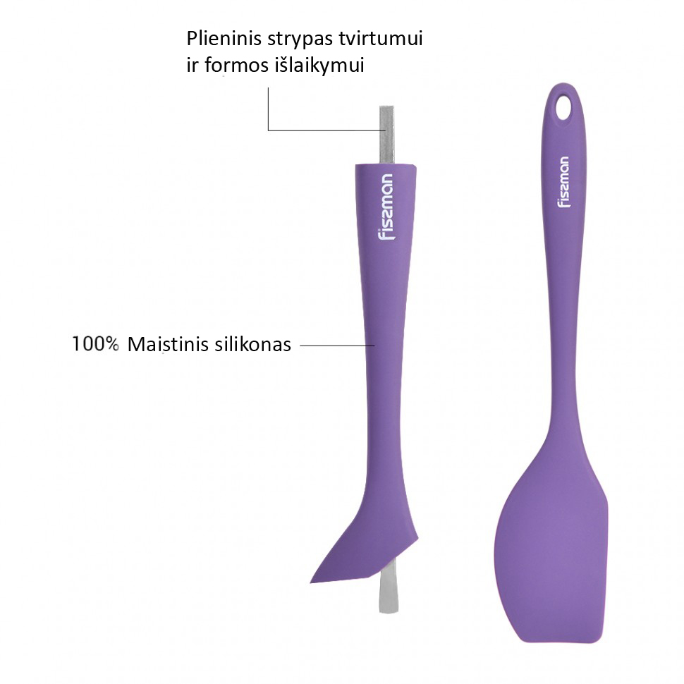 Dieser Spatel vereint Festigkeit und Flexibilität. Der Stahlstab im Inneren verleiht ihm Festigkeit und verhindert Verformungen, während die äußere Silikonschicht flexibel und hitzebeständig bis zu +230 °C ist. Dadurch können Sie heiße Speisen sicher in der Pfanne wenden.