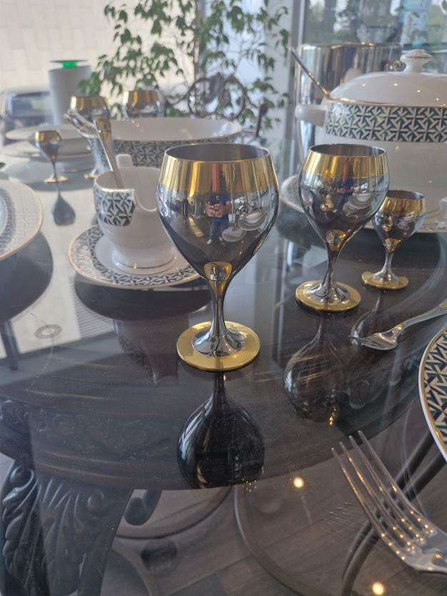 Der Satz besteht aus elegant geformten 6 Wasser- und 6 Weingläsern sowie 12 Tellern. Jedes Glas hat eine präzise Höhe und Kapazität, um eine bequeme Benutzung und exzellente Bedienung zu gewährleisten. Die Teller eignen sich ideal für die Präsentation verschiedener Gerichte. Die Goldbeschichtung, mit einer Dicke von 0,2 Mikronen, verleiht nicht nur dem Service ein luxuriöses Aussehen, sondern schützt auch vor Rost und Abnutzung, wodurch der Service lange in einem hervorragenden Zustand bleibt.