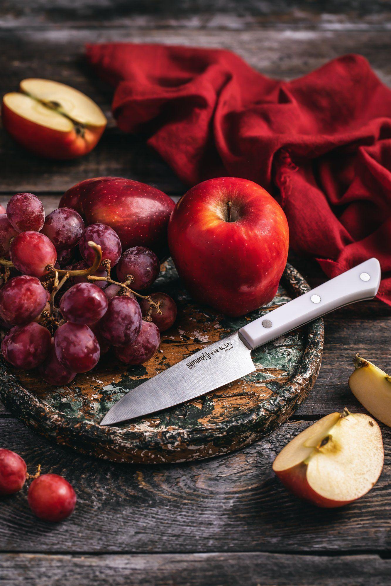 Ein Designmerkmal eines Küchenmessers zum Schälen von Gemüse und Obst ist eine kurze Klinge. Dieser Umstand sowie die perfekte Balance der Klinge mit dem Griff und das extrem geringe Gewicht machen es möglich, das Samura Harakiri-Messer auch über lange Zeit hinweg problemlos zu führen und jede Menge Arbeit schnell zu bewältigen.