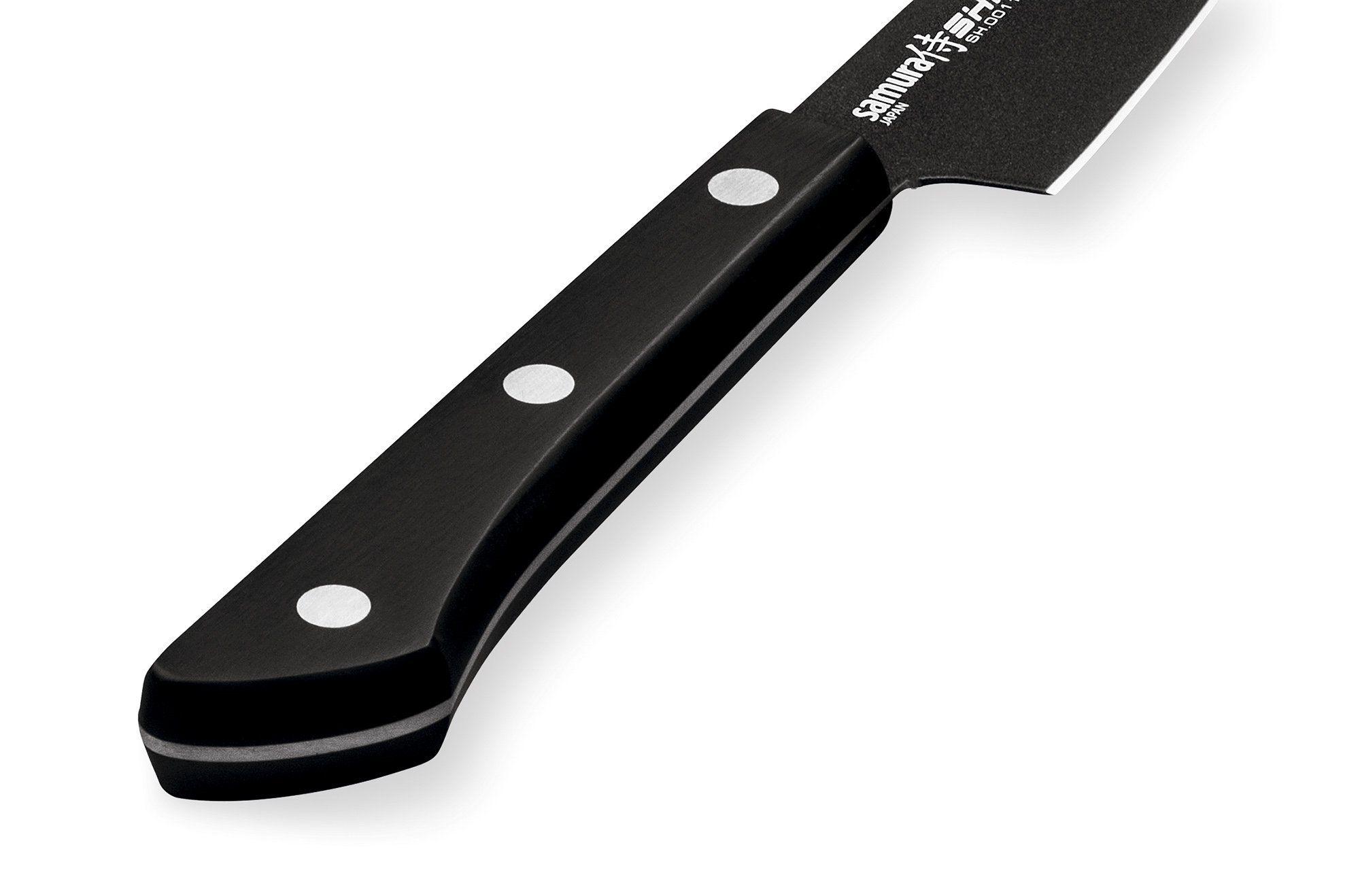 Mit einer kurzen, rasiermesserscharfen Klinge können Sie schnell die Haut von Gemüse oder Obst abziehen, sie für Salat oder Eintopf in Stücke schneiden. Nicht weniger effektiv und sehr genau ist es, die “Augen” und den Kern von den Produkten zu entfernen. Dafür ist die dünne Schneide des Gemüsemessers Samura Shadow praktisch.