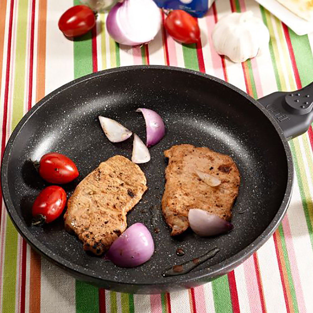 - ACHTUNG: Bei Verwendung der Pfanne im Ofen oder bei längerem Kochen auf dem Herd kann der Stahlgriff sehr heiß werden. Verwenden Sie immer einen hitzebeständigen Handschuh.