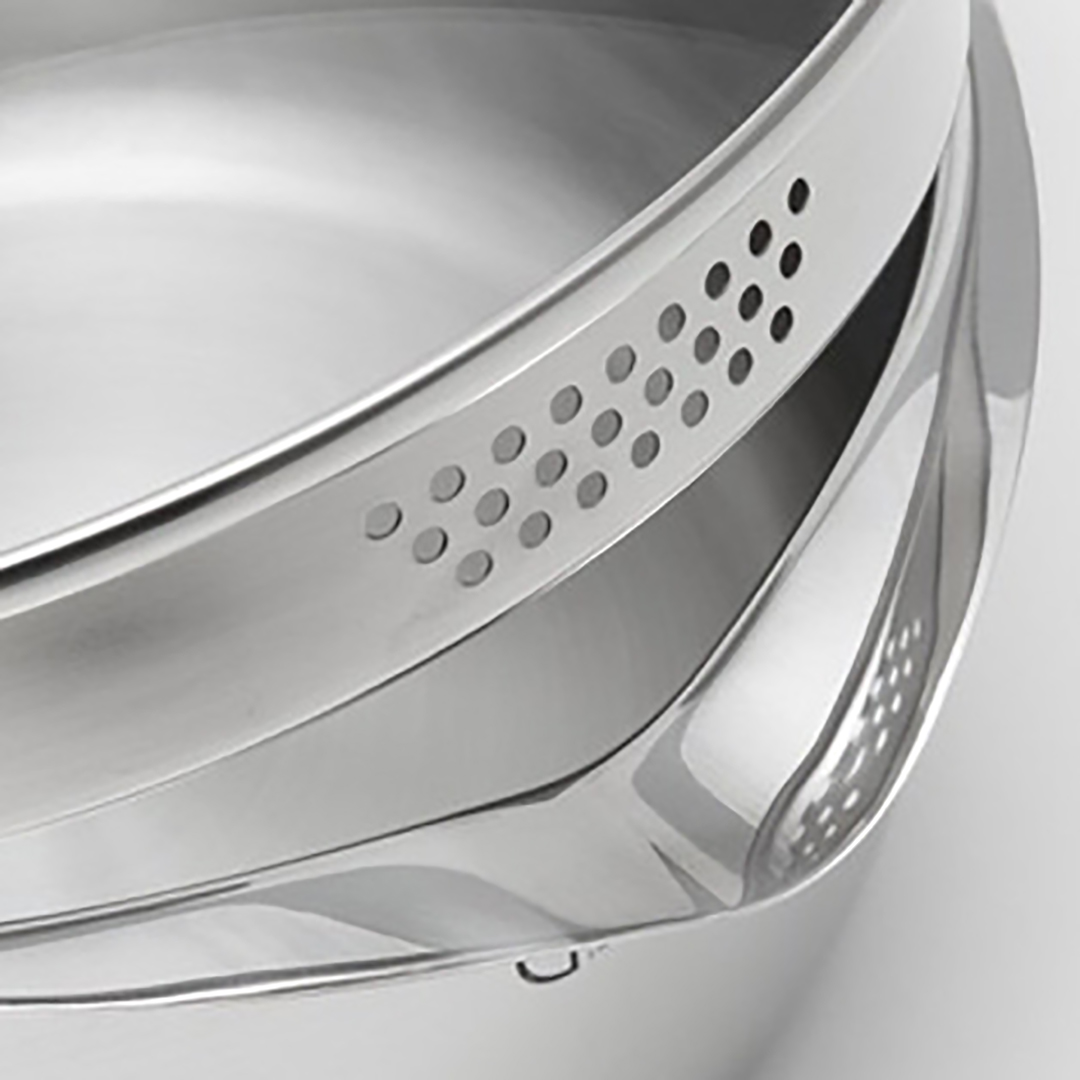 Doppelte Funktionalität (Abgießen): Der Glasdeckel hat spezielle Löcher, die helfen, Wasser abzugießen (z. B. beim Kochen von Kartoffeln oder Nudeln) ohne zusätzliches Sieb.