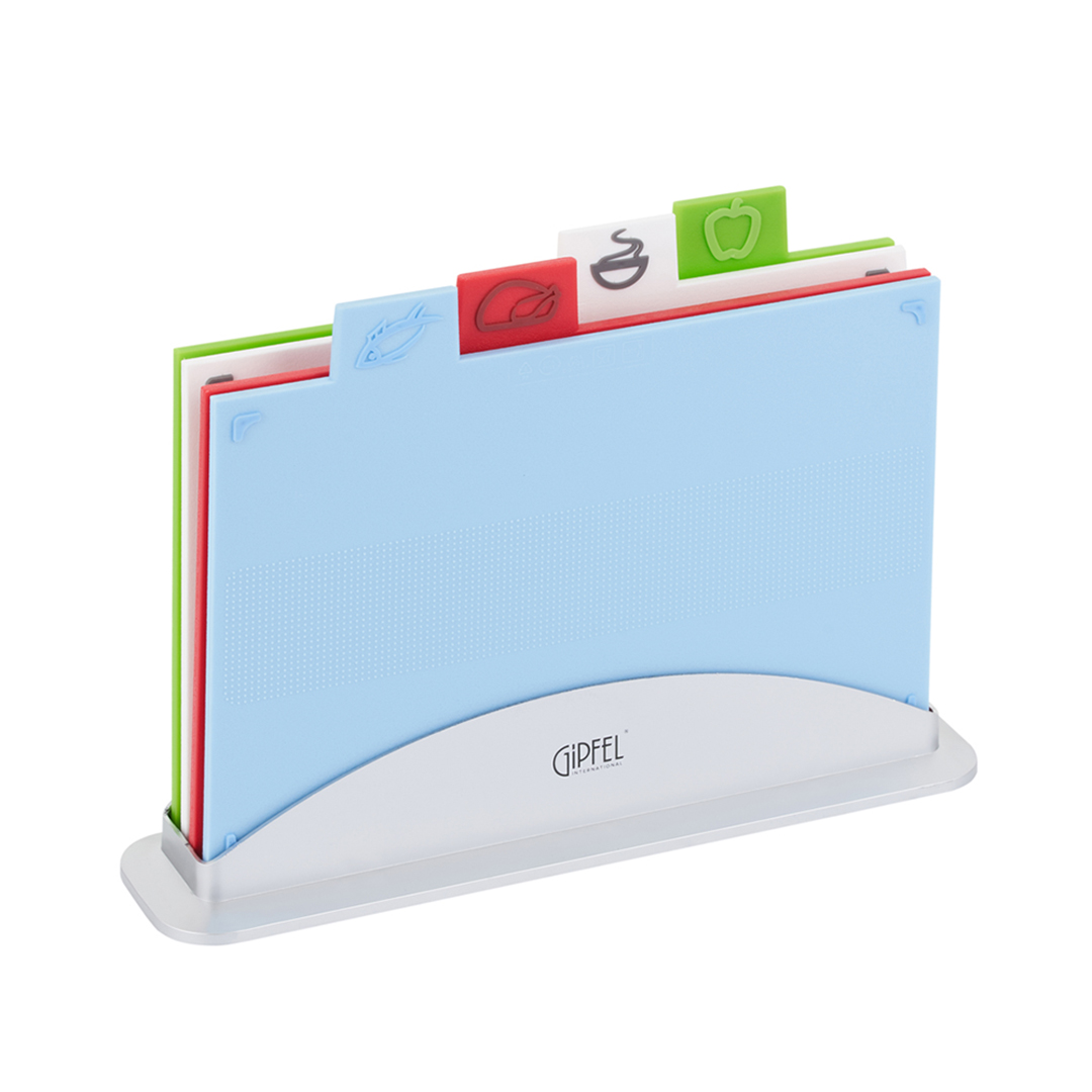 Wir präsentieren GIPFEL Galaxy 50963 – ein praktisches und stilvolles 4er-Schneidebrett-Set mit Ständer. Es ist die ideale Lösung für alle, die Wert auf Hygiene und Ordnung legen. Jedes Brett hat eine spezielle Kennzeichnung, die angibt, für welche Produkte es bestimmt ist, sodass Sie Kreuzkontaminationen vermeiden.