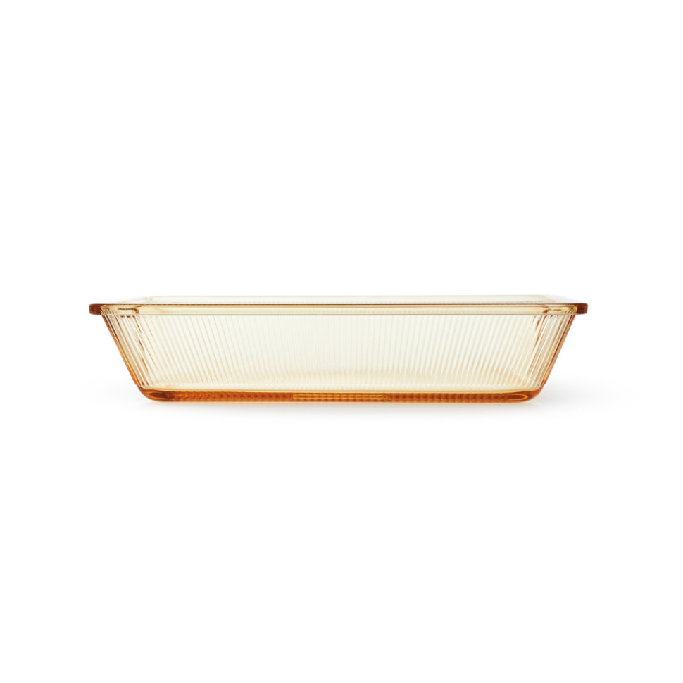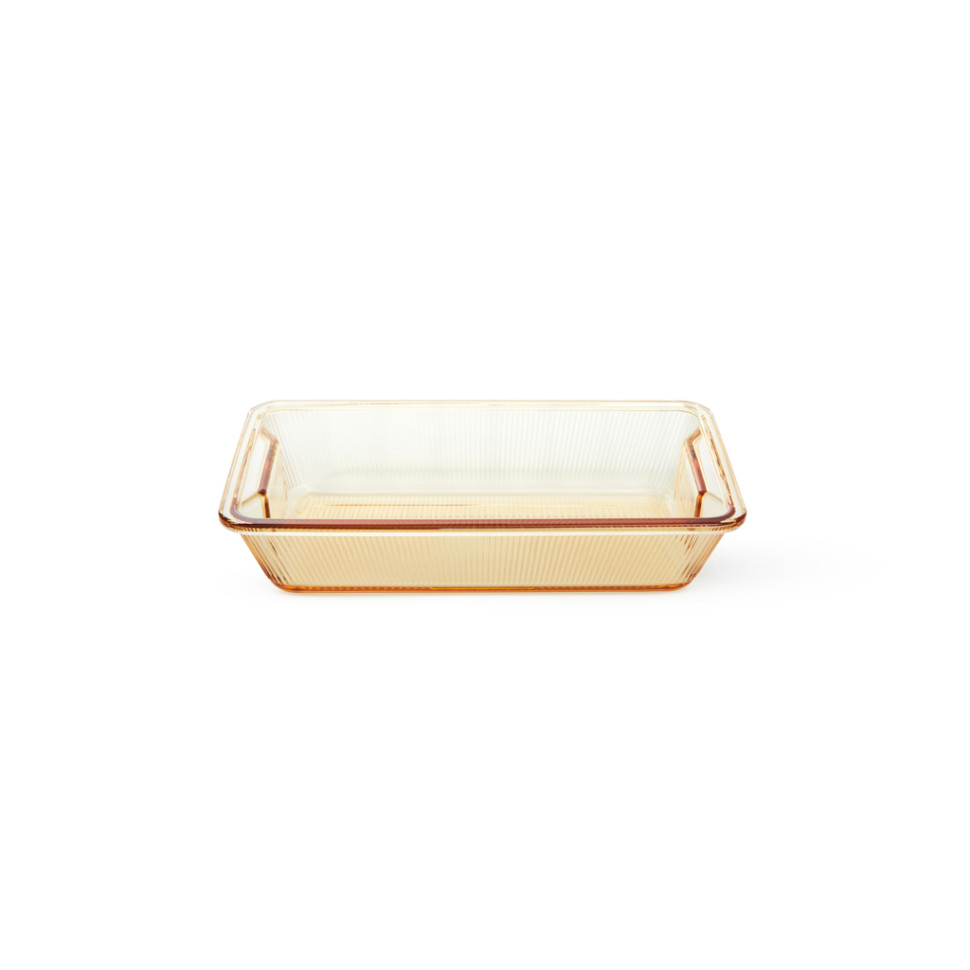 Dieses Gefäß ist aus robustem Borosilikatglas gefertigt, das sich durch außergewöhnliche Hitzebeständigkeit auszeichnet. Das Design der Form ist sehr einzigartig – das bernsteinfarbene Glas hat stilvoll geriffelte Ränder und praktische integrierte Griffe an den kurzen Seiten. Der Boden des Gefäßes hat eine spezielle Präge-(texturierte) Beschichtung, die dazu beiträgt, die Struktur des Lebensmittels zu erhalten.